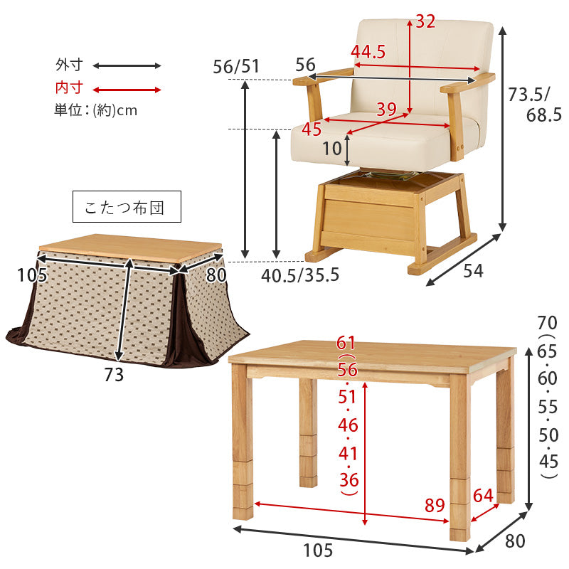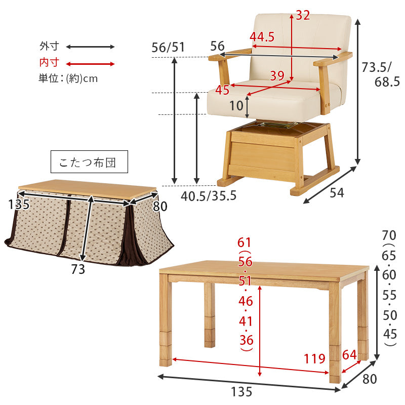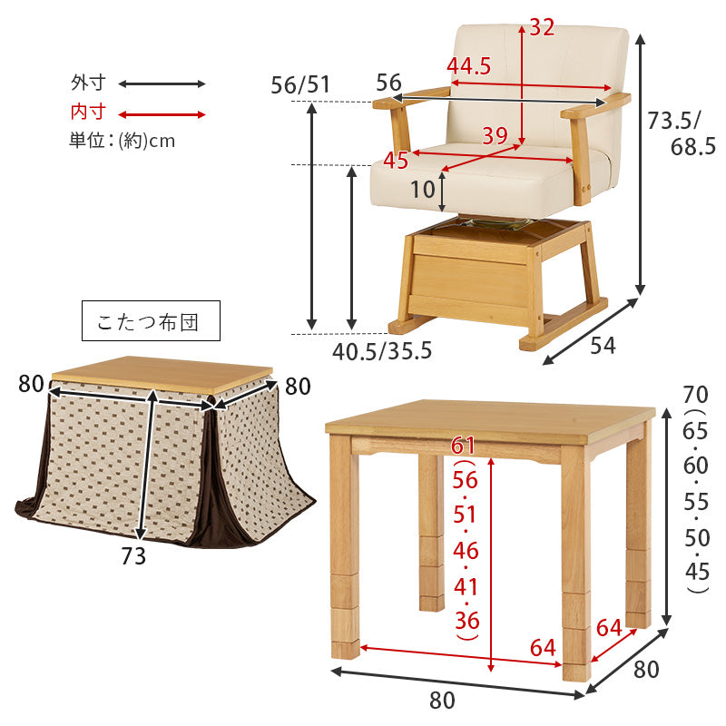 (約)幅56×奥行54×高さ73.5/68.5×座面高40.5/35.5cm(約)幅56×奥行54×高さ73.5/68.5×座面高40.5/35.5cm