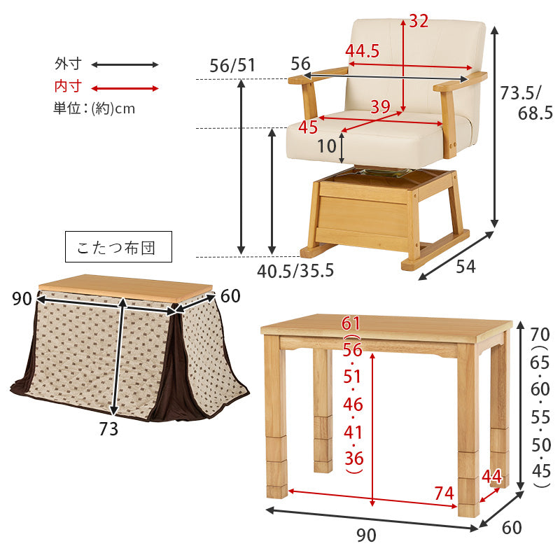こたつ:(約)幅90×奥行60×高さ45/50/55/60/65/70cm
