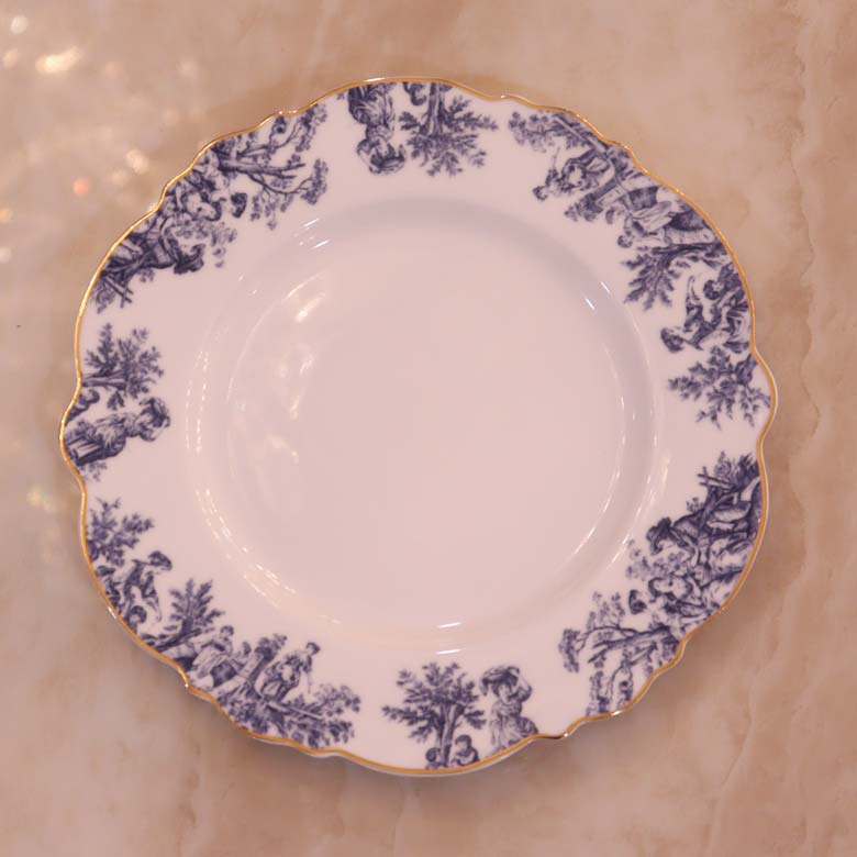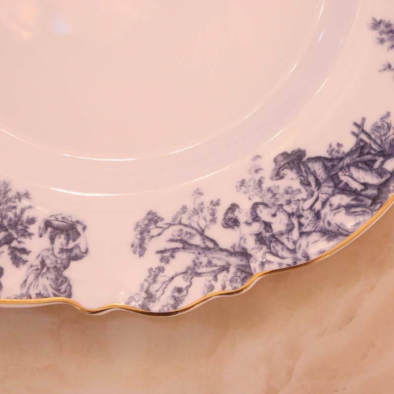 上品な深みのある色合いででヨーロッパの人々の生活をプリントしたトワルドジュイシリーズのケーキ皿。