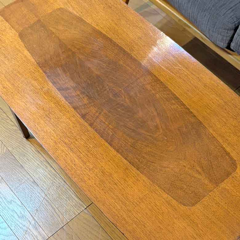 中央に異なる木目のチーク材を配した、バイカラーのような切り替えデザインが特徴。シンプルながらも視覚的なアクセントがあり、お部屋の主役になれる一台です。