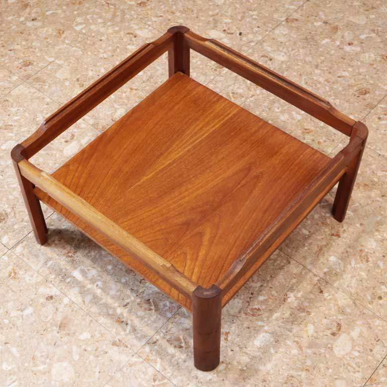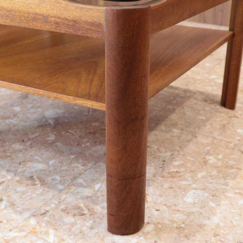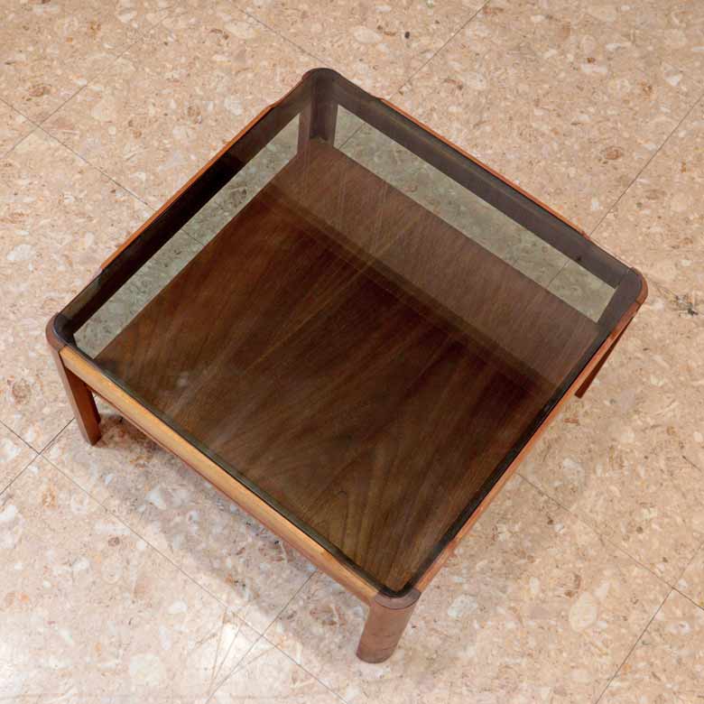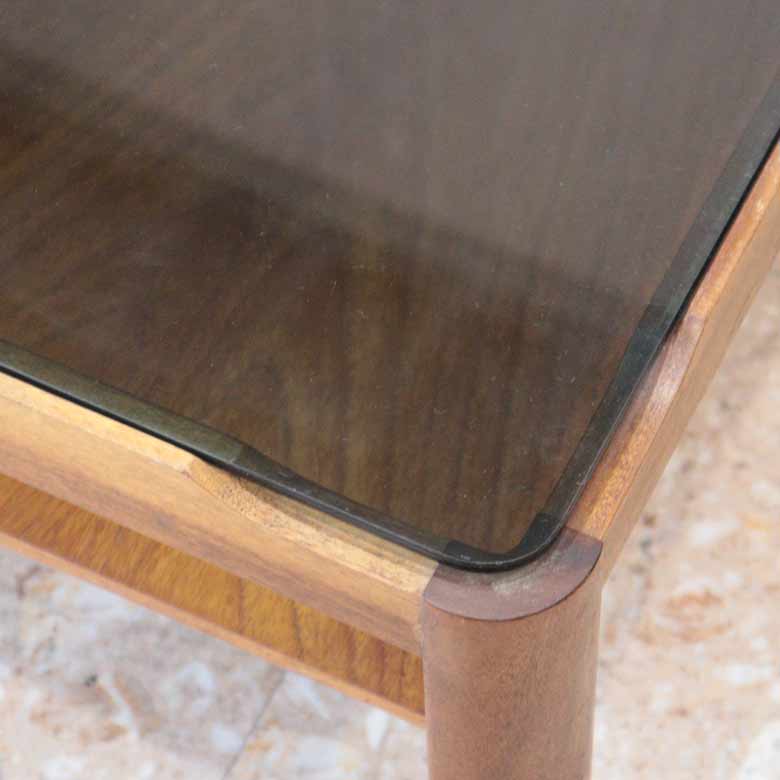 チーク材の温かみあるフレームにスモークガラスの天板を組み合わせたデザインは、ミッドセンチュリーらしいモダンな雰囲気を漂わせます。