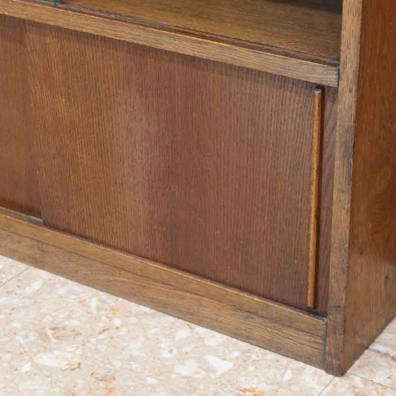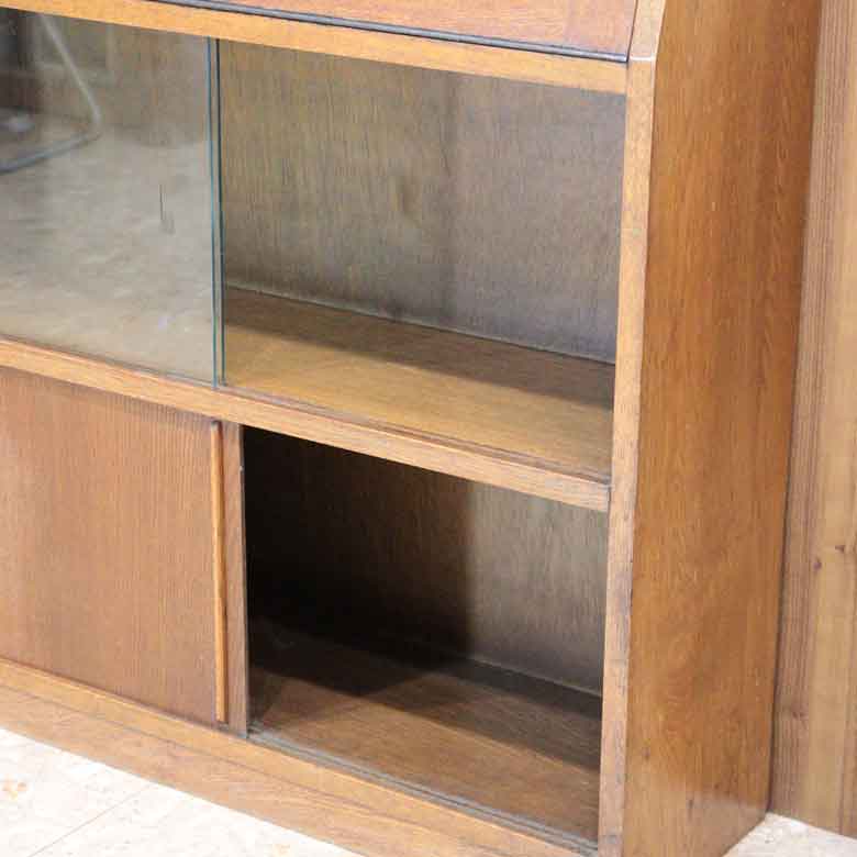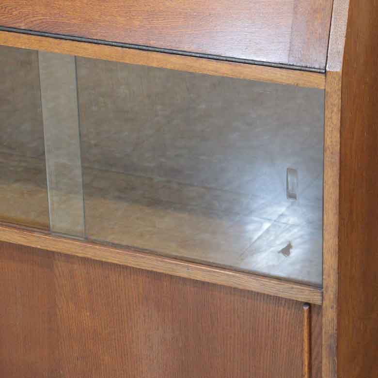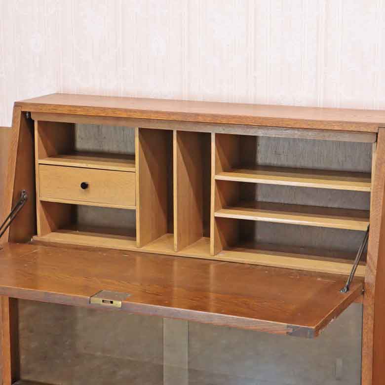 下部収納(ブックケース): 下部には、ガラス扉と木製の引き戸の棚があり、書籍やコレクションなどを収納できます。この書棚の機能を持つタイプは「ブックビューロー」とも呼ばれます。