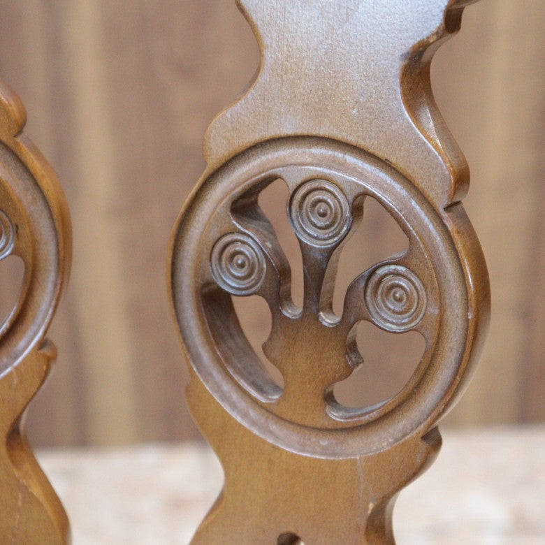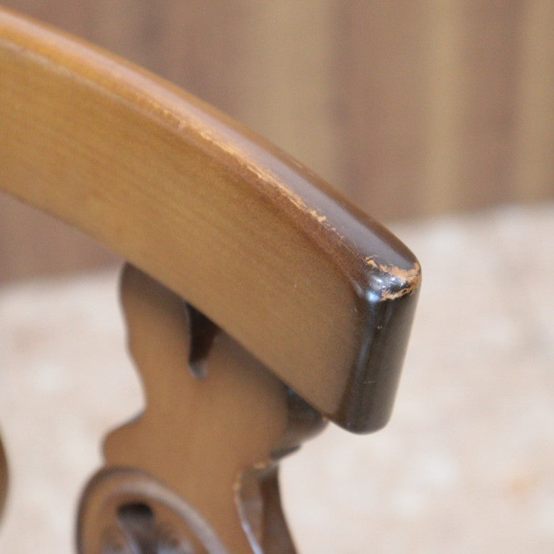 繊細な背もたれの意匠と、滑らかにカーブした座面が織りなす優雅な佇まい。 花柄のファブリッククッションが柔らかな印象を添え、ヴィンテージらしい温もりを感じさせます。