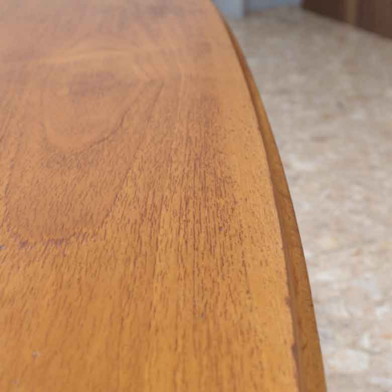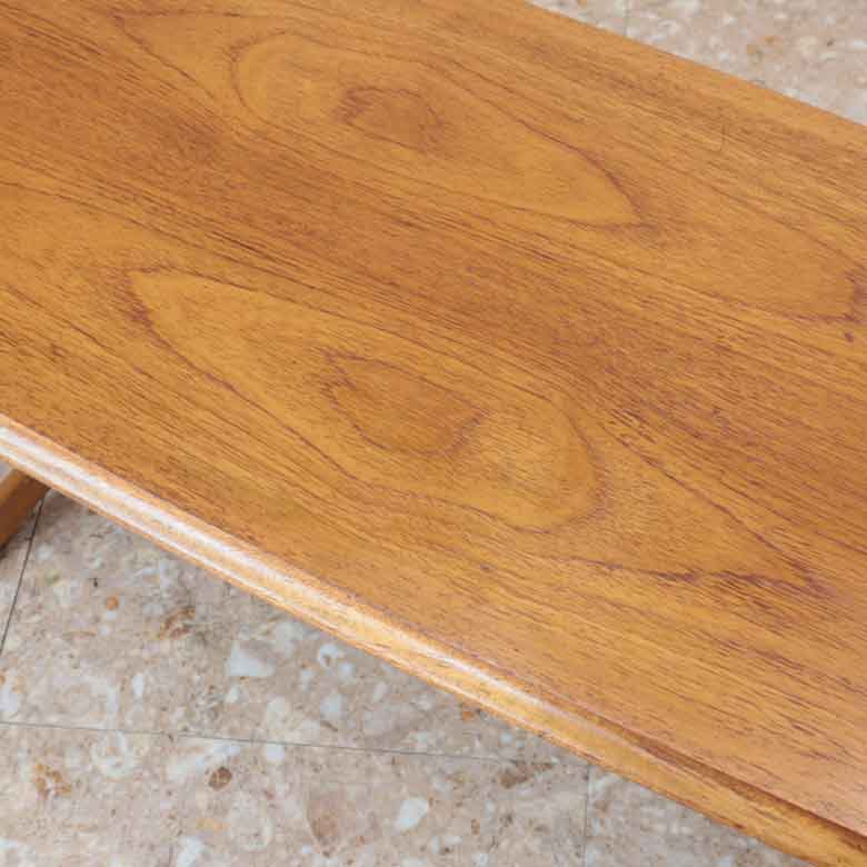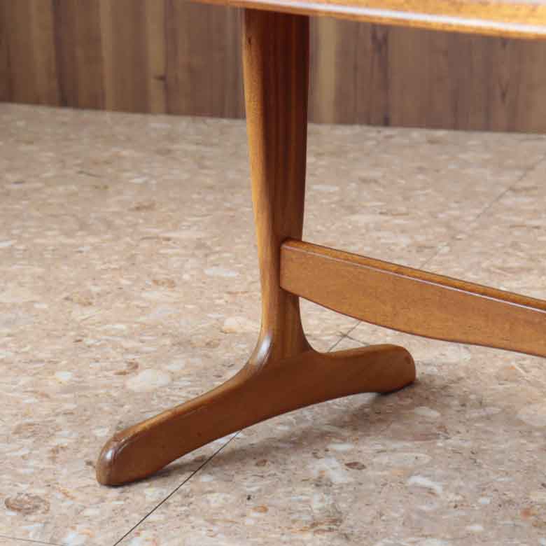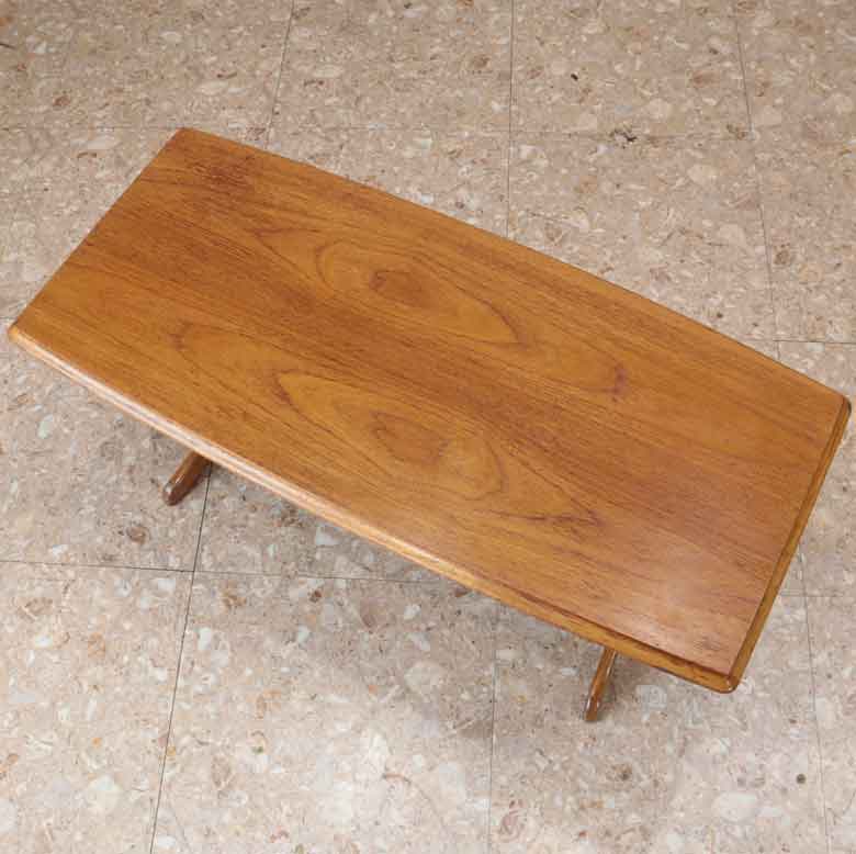 上質なチーク材を使用し、美しい木目と温かみのある色合いが魅力です。最大の特徴は、鯨の尾を思わせる優美な「ホエールレッグ」の脚部デザイン。ミッドセンチュリーらしい直線的な天板とのコントラストが、軽やかで洗練された印象を与えます。