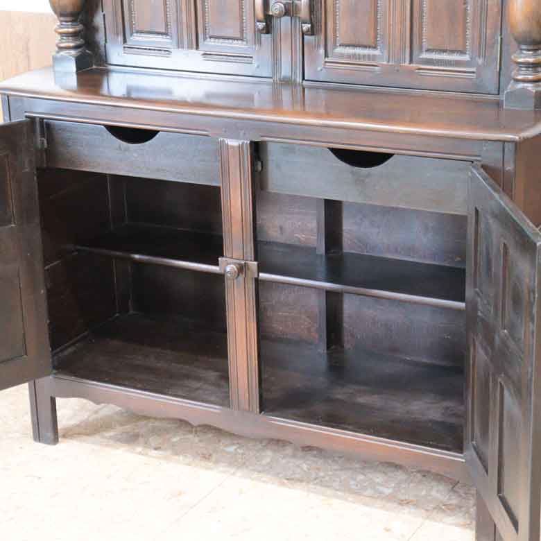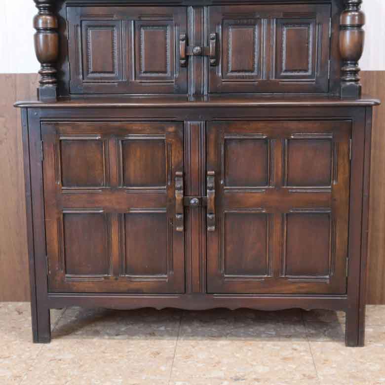 重厚感あふれるオーク材の質感と、格調高いパネルデザインが魅力。上段・下段に分かれた収納スペースは、食器やリネン、小物などを美しく整理できます。