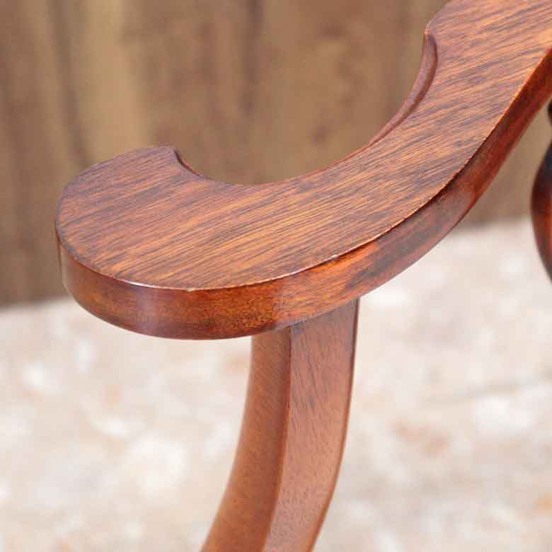 背もたれには、チッペンデール様式の特徴であるリボン状の透かし彫りを思わせる、優美な曲線を用いた装飾的な背板が施されています