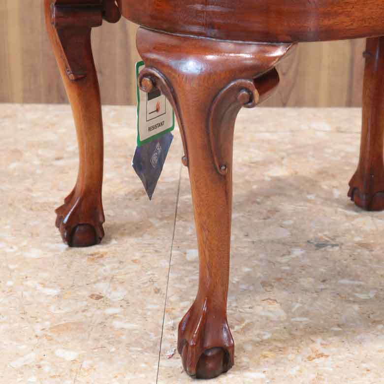 脚部は、優雅な曲線を描くカブリオールレッグ(猫脚)で、先端は力強いボール・アンド・クロウ・フット(球を掴む爪の足)と呼ばれるデザインで仕上げられています