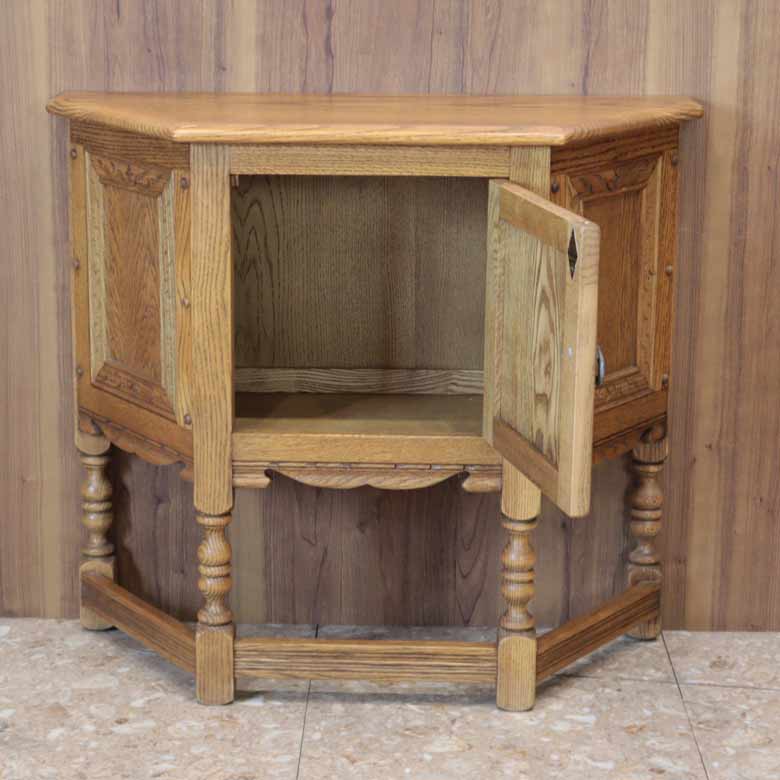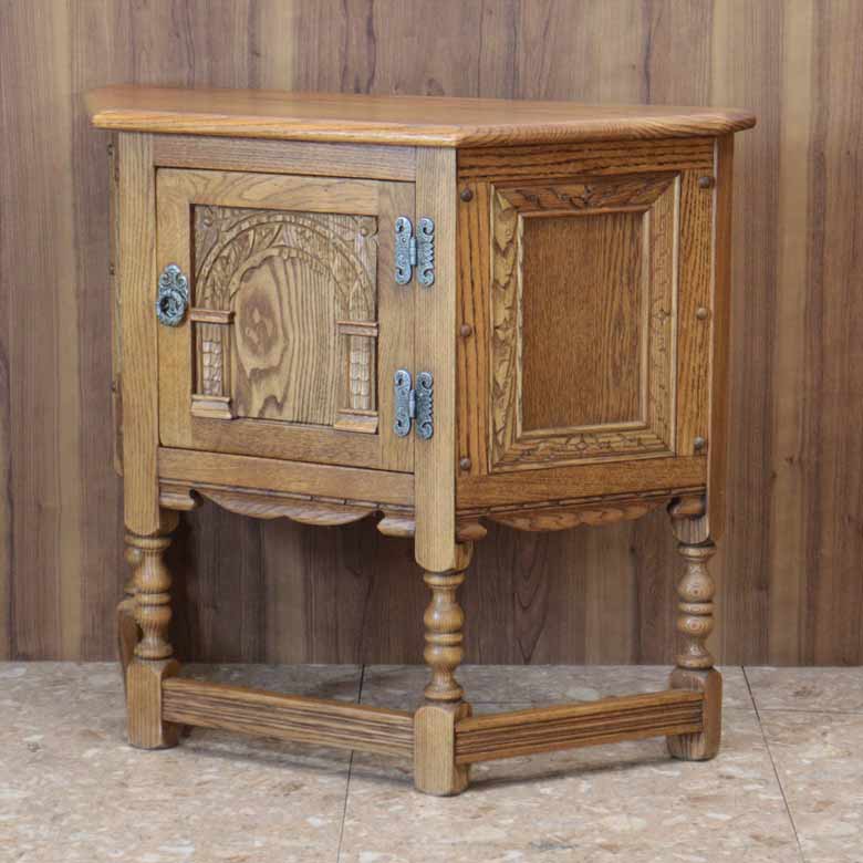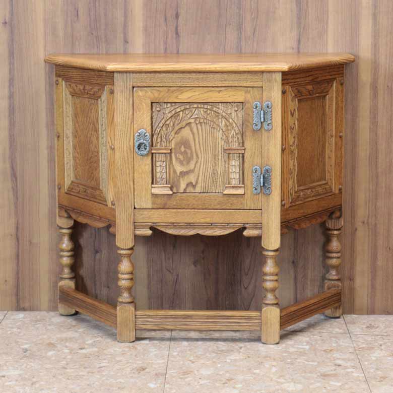 イギリスの老舗ブランド Old Charm(オールドチャーム) による、チューダースタイルのカンテッドテーブル型スモールキャビネット。