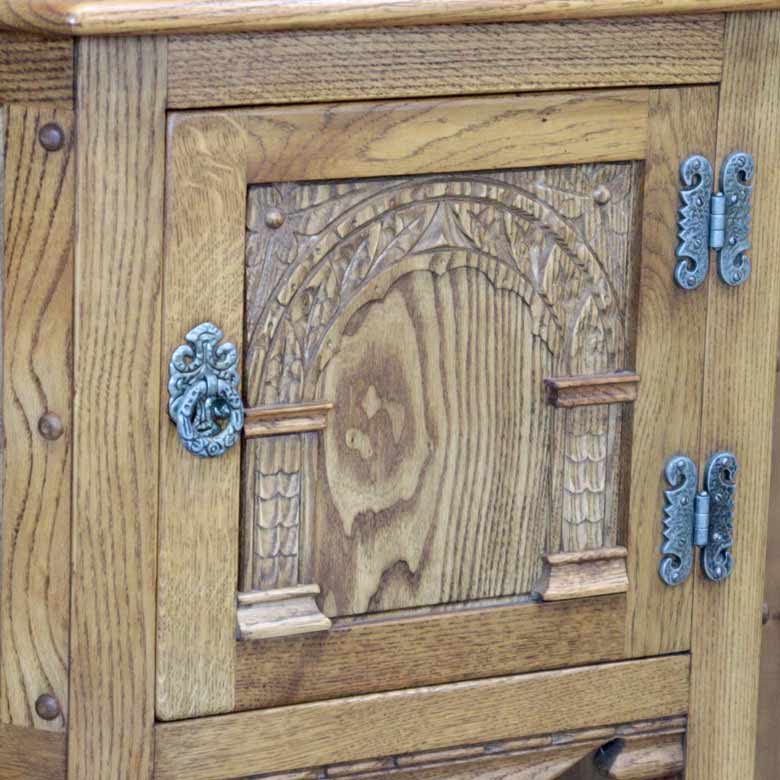 堅牢なオーク材を使用し、正面扉にはアーチモチーフの美しい彫刻が施され、チューダー様式らしいクラシカルな存在感を放っています。側面にもフレーム装飾が入り、細部まで丁寧に仕上げられた一品です。