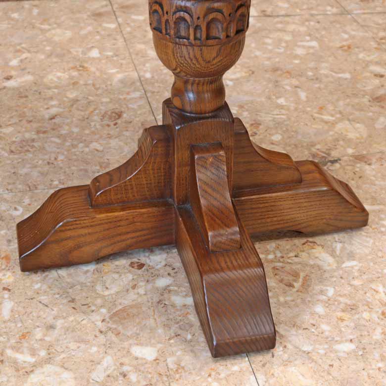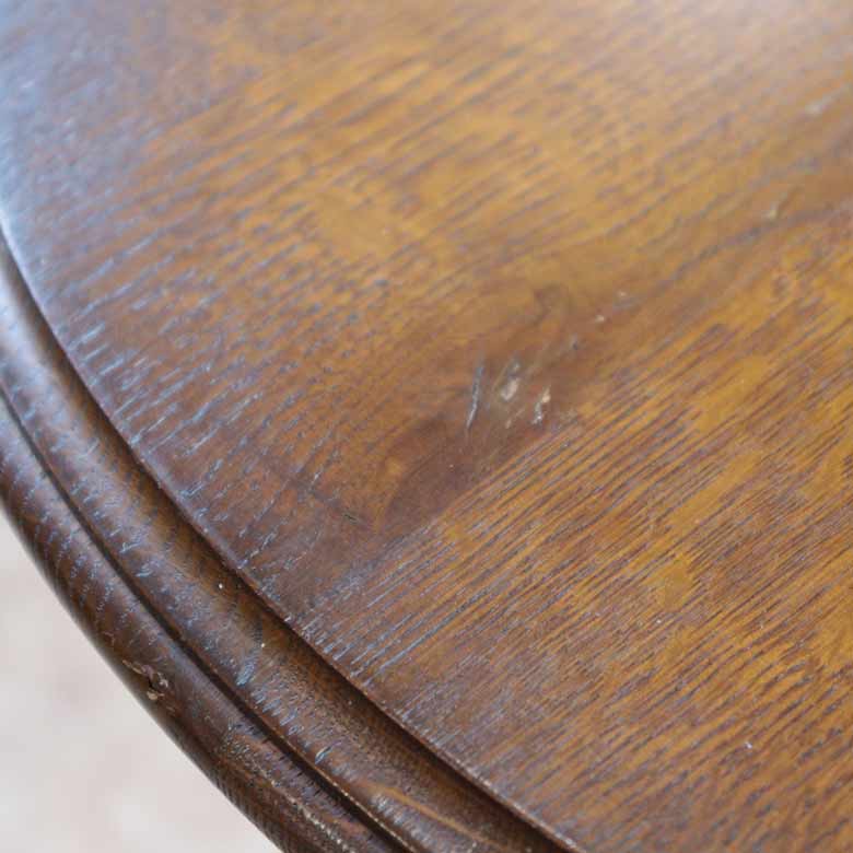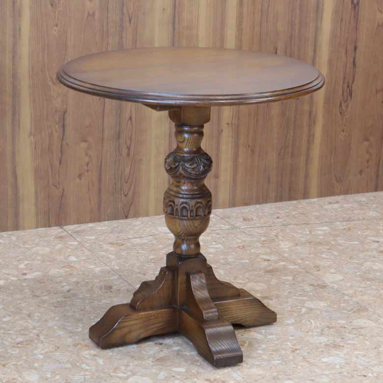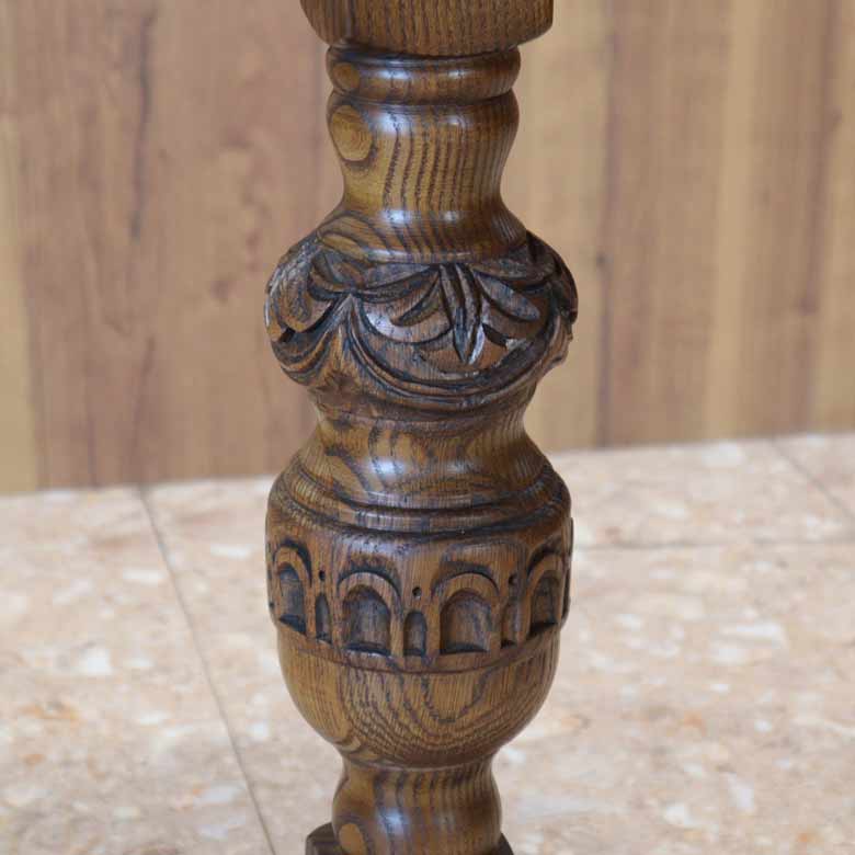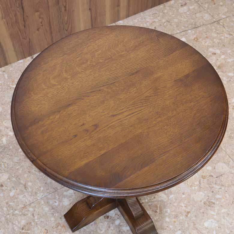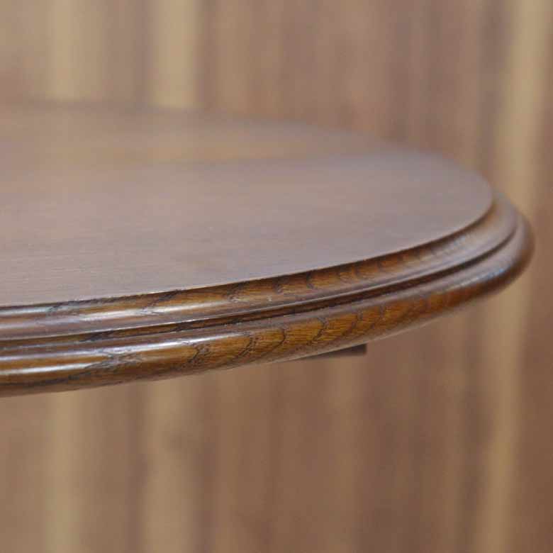 伝統的なオーク材を用いた重厚感ある佇まいと、手仕事を感じさせる彫刻が魅力の一台。丸型の天板はコンパクトながら存在感があり、ティーテーブルやサイドテーブルとしてお使いいただけます。安定感のある脚部デザインがクラシカルな雰囲気を醸し出し、アンティークやクラシックスタイルのインテリアと相性抜群です。