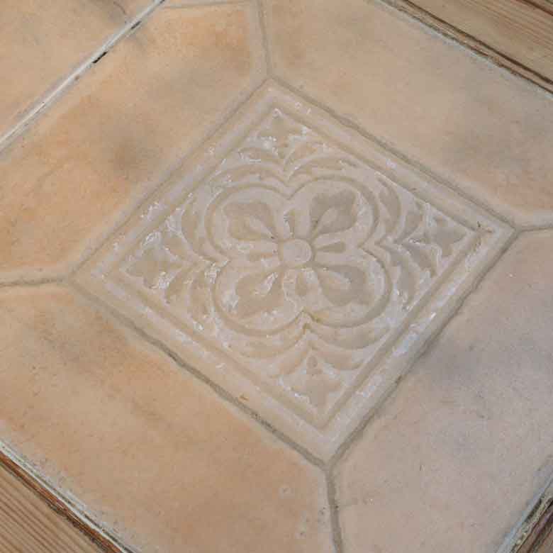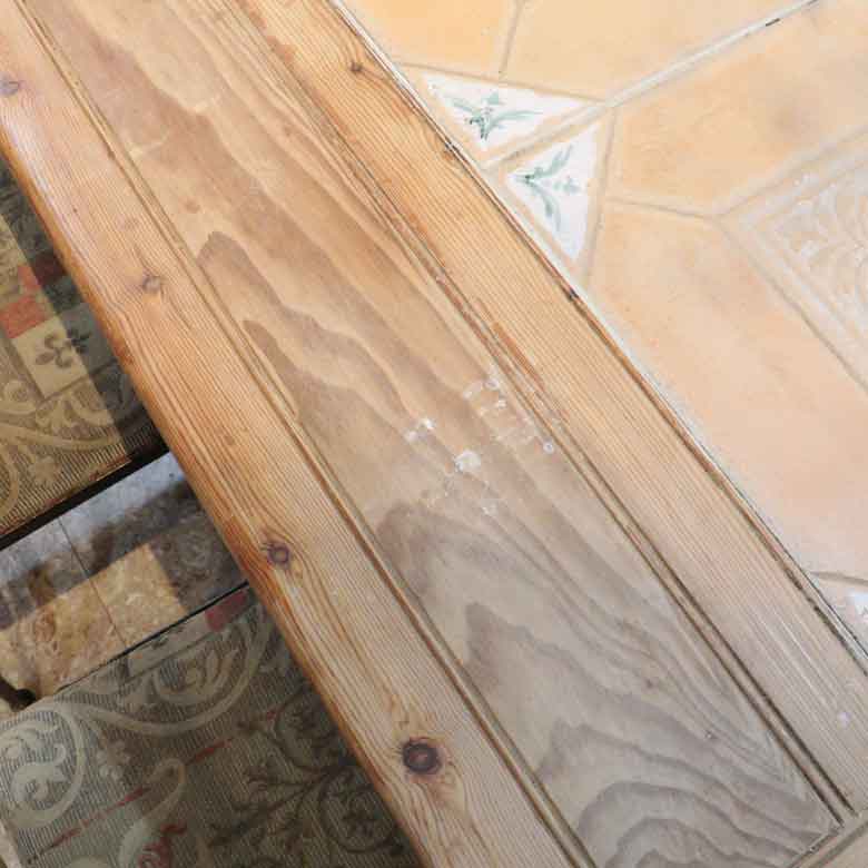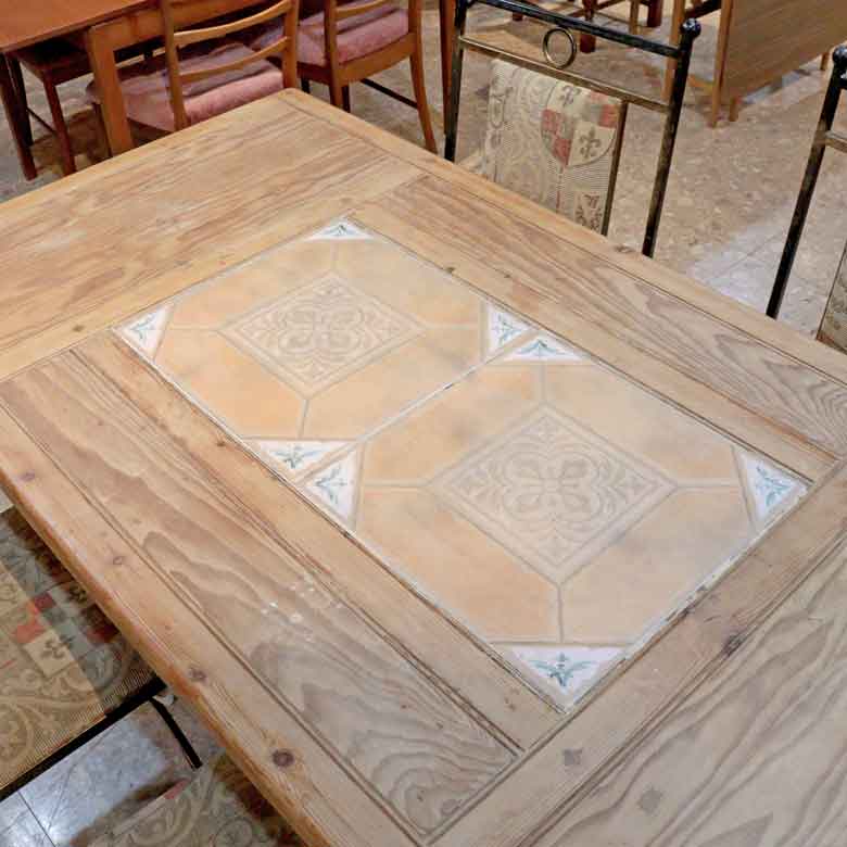 テーブル中央には、繊細な浮き彫り(エンボス)加工が施された大判のタイルが2枚嵌め込まれています。タイルは熱い鍋やカップを置くのにも強く、実用性とデザイン性を兼ね備えています。