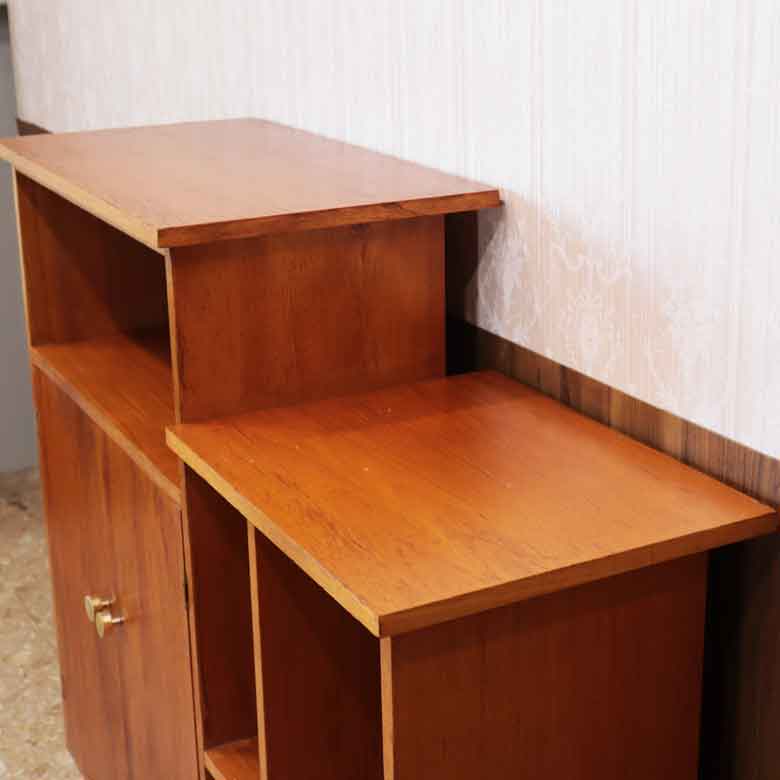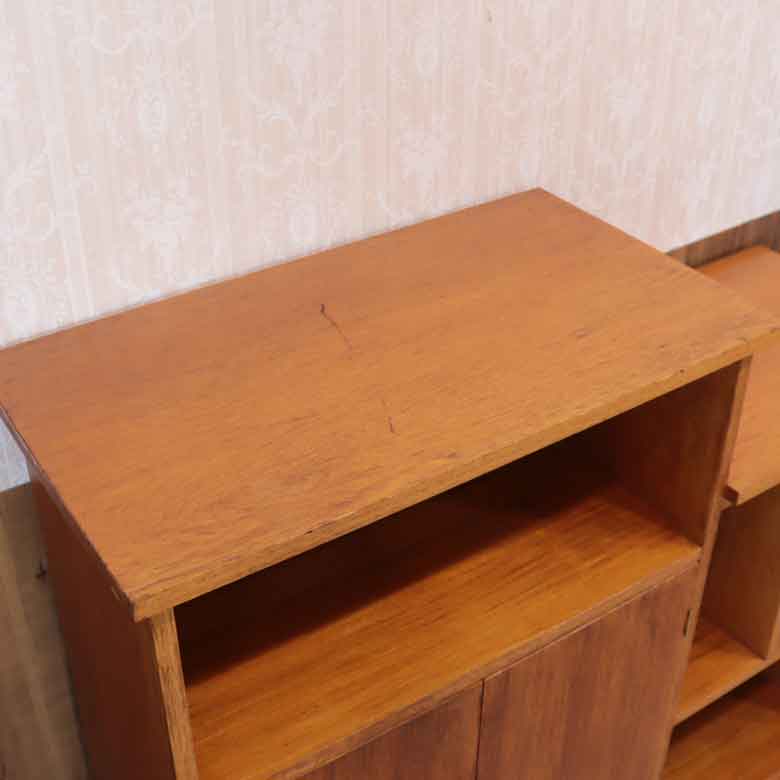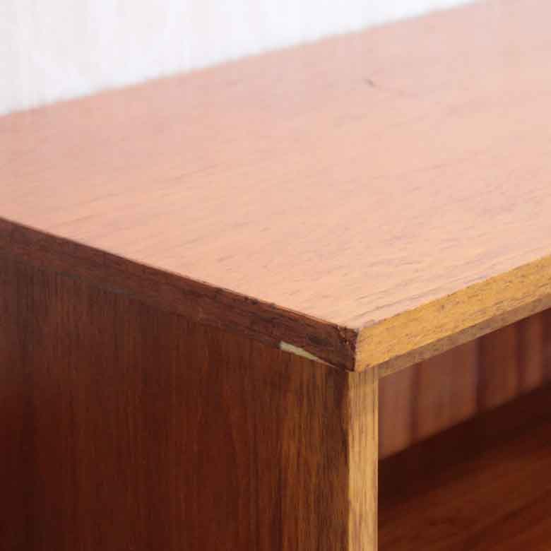 コンパクトなサイズ感ながら、オープンとクローズドの収納を兼ね備えているため、リビングボード、サイドボード、レコードキャビネット、書斎のブックシェルフなど、様々な用途でお使いいただけます。チーク材の温かみのある色合いは、北欧系のインテリアやモダンな空間にもよく馴染みます。