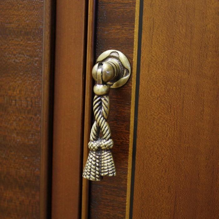 単板を幾層にも張り合わせる成形技法で作られた、柔らかな局面の扉や前板の周りに、細いリブラインをあしらいタッセルをモチーフにした把手を採用し、繊細なイメージを強調しています。