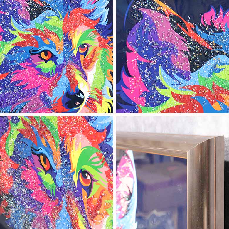 インパクトがあるアートの表面にアクリル樹脂でコーティングを施し、立体感のある仕上がりになっております。