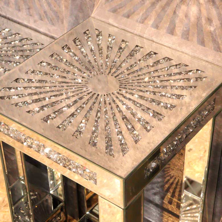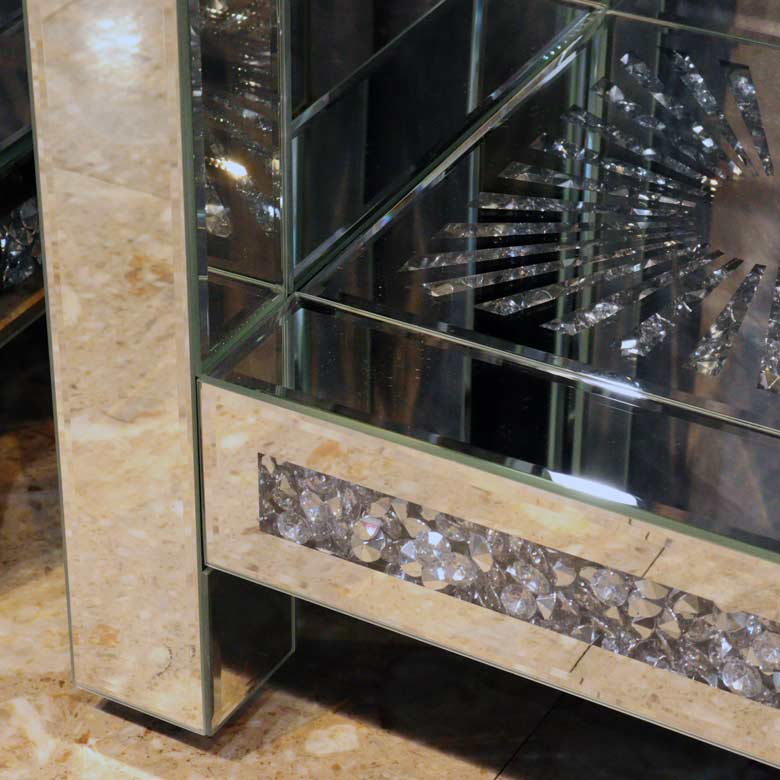 ガラスやマーブル・アイアンなど魅力的な質感の素材を用い、メタリックやピンクの目目を惹くアクセントカラー。グラマラスインテリアの家具シリーズ