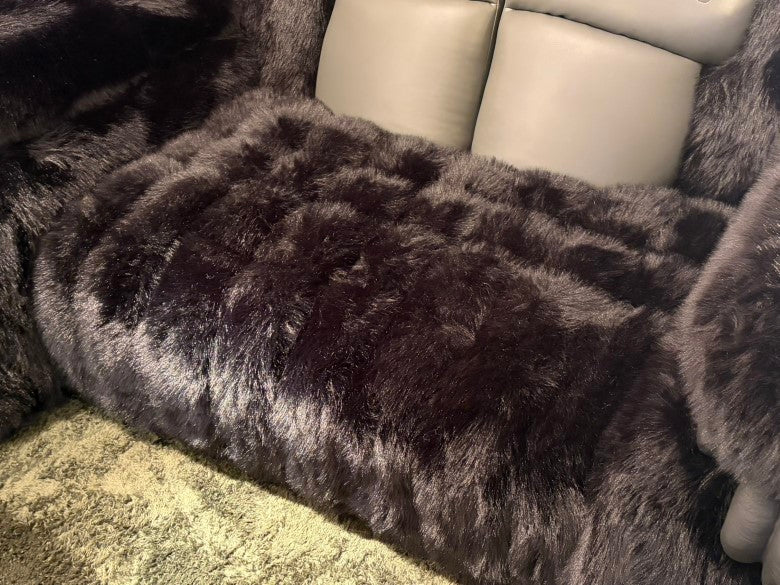 ゴージャスな肌触り: 体全体を覆うのは、深くリッチな黒色のフェイクファー。毛足が長く、ふわふわで柔らかな肌触りが、座る人を優しく包み込みます。(写真1枚目)