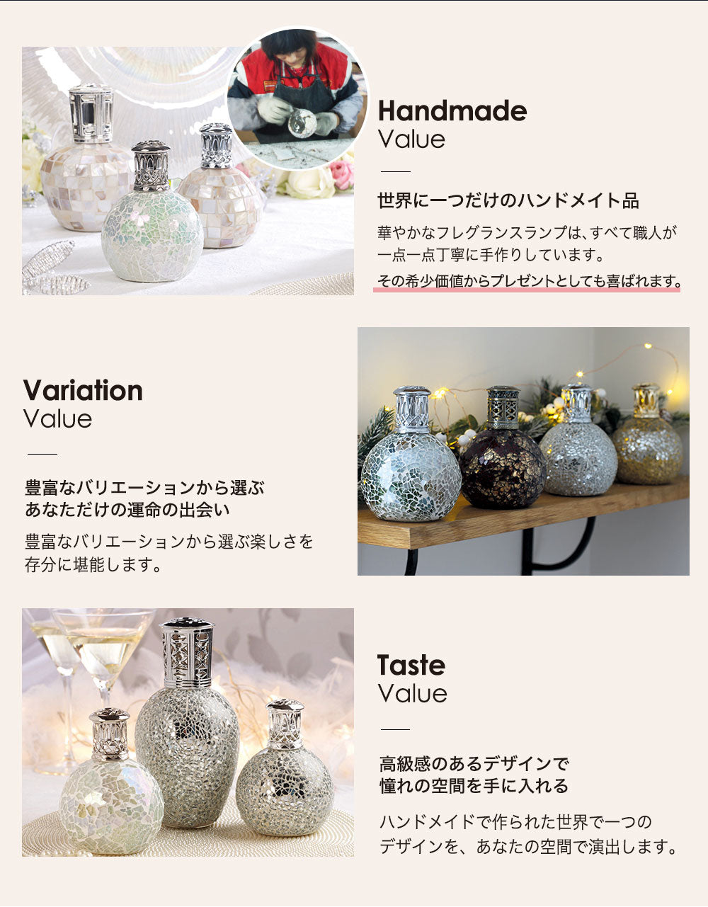 華やかなモザイクガラスのランプボトルは手作りのため世界に一つだけしかない自分だけのランプボトルが見つかります。