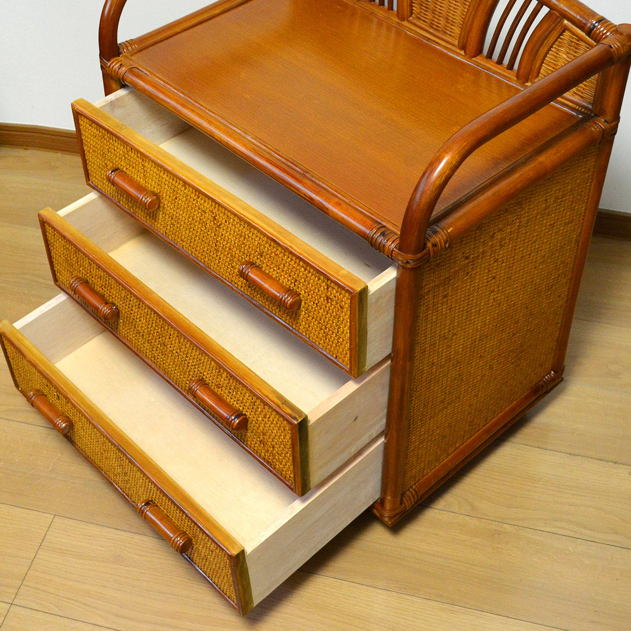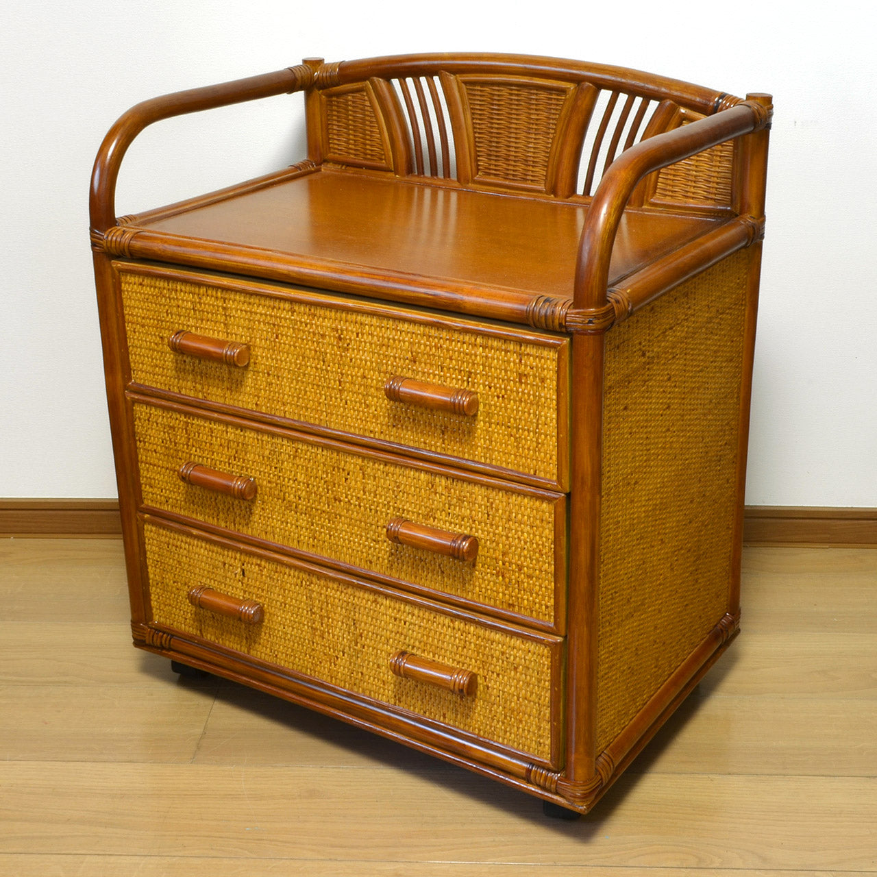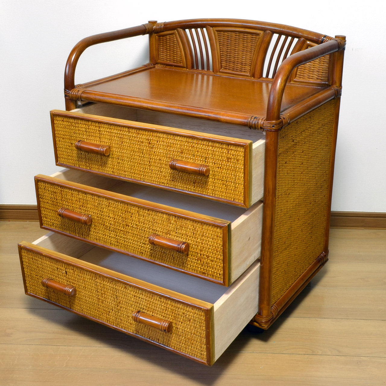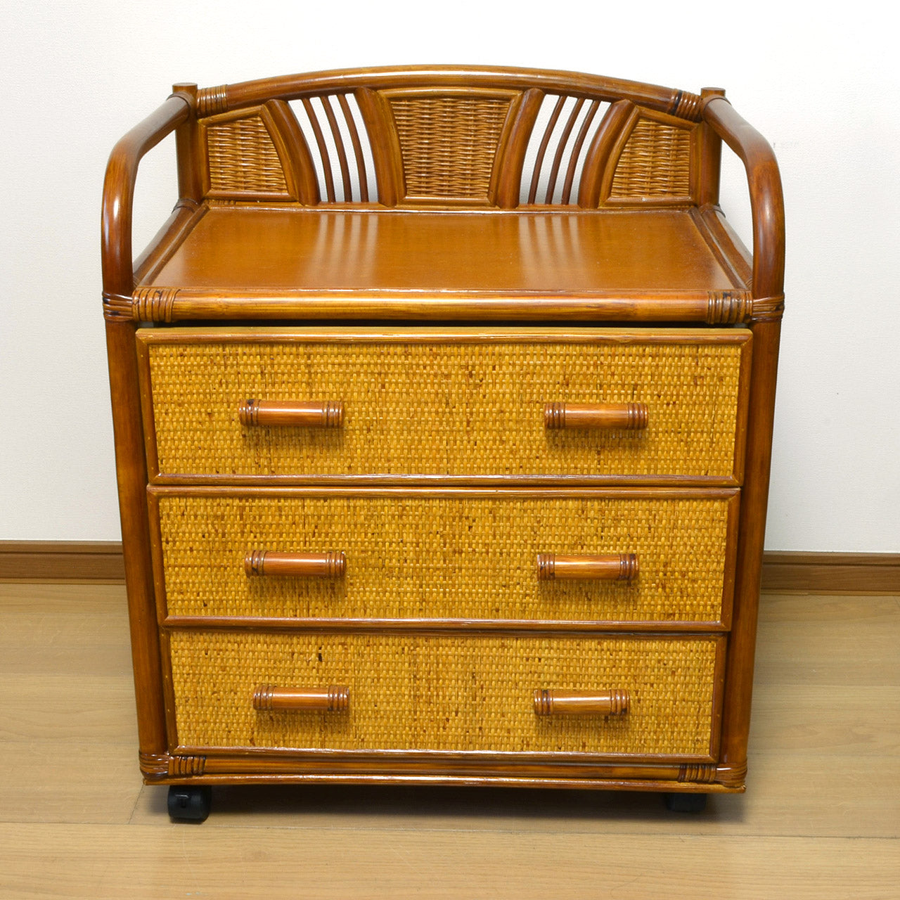 キャスター付きラタンチェスト 3段 飾り枠付き 完成品