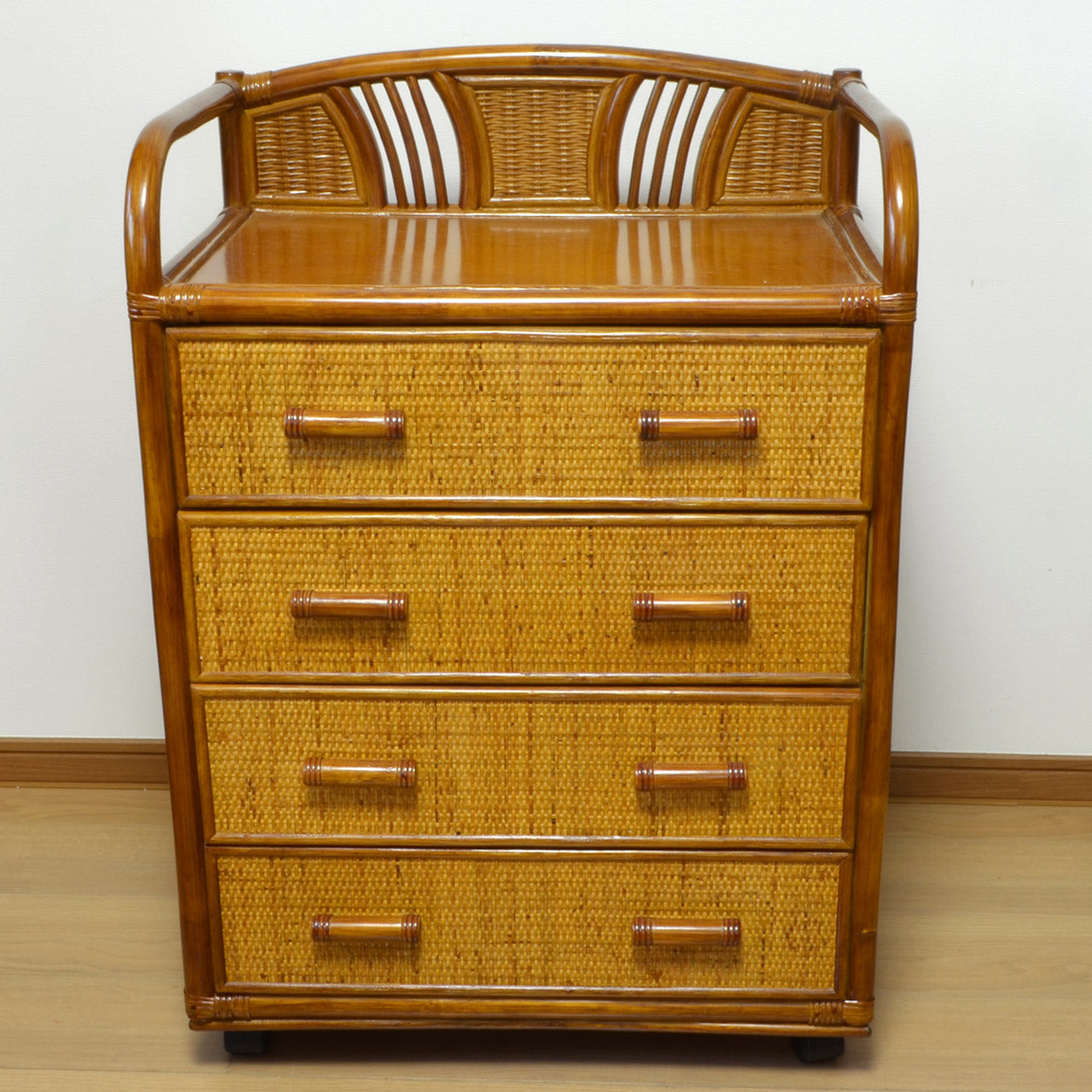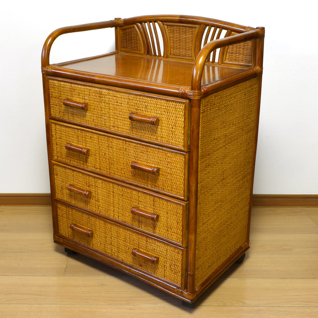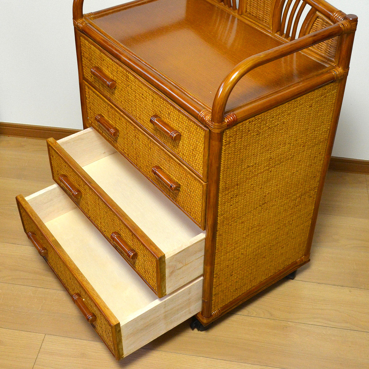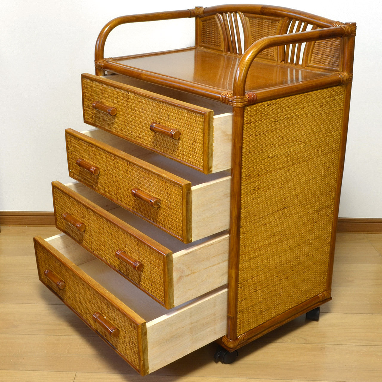 キャスター付きラタンチェスト 4段 飾り枠付き 完成品