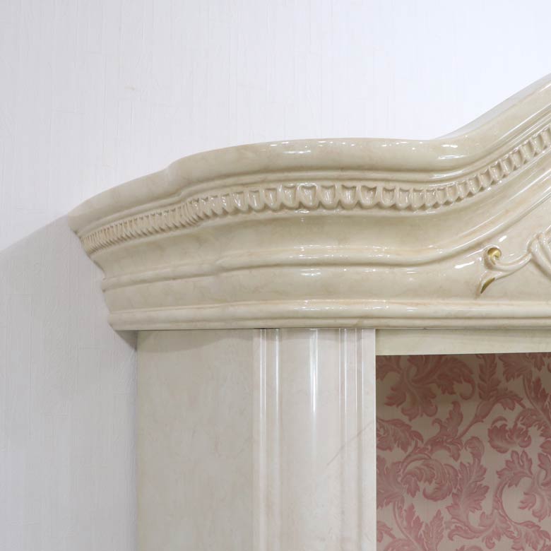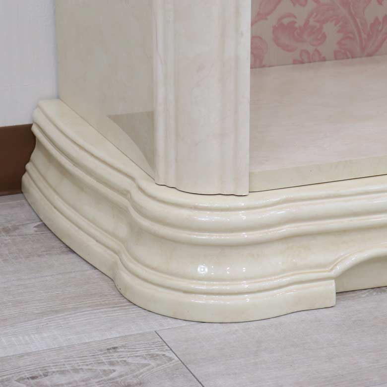 テーブルの脚はシェル(二枚貝)をモチーフ、サイドボード鏡はそれが大きく開いたようなシルエット。芸術家ボッティチェリの『ビーナス誕生』を思い起こします。 ペールピンクアクセントは生命の躍動、美の象徴です。
