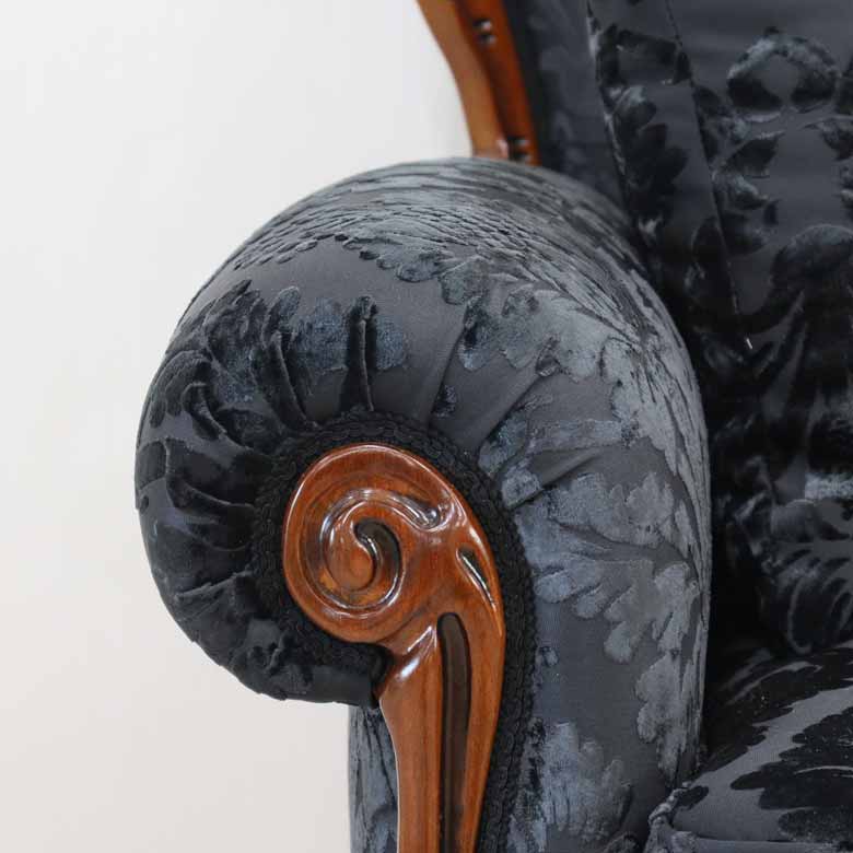 ◆イタリアの現地職人が丹精込めた繊細な彫刻が、フレーム部分や脚部全体に施されています。