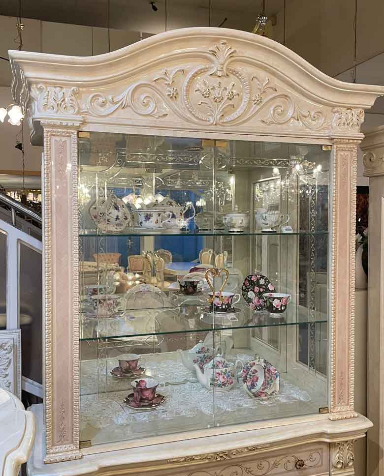 王冠のような天飾りと猫脚、ゴールドの装飾金具と アラベスク紋様のガラス扉、宮廷風のテイストがより ラグジュアリーな風格のヴェルサイユシリーズ。
