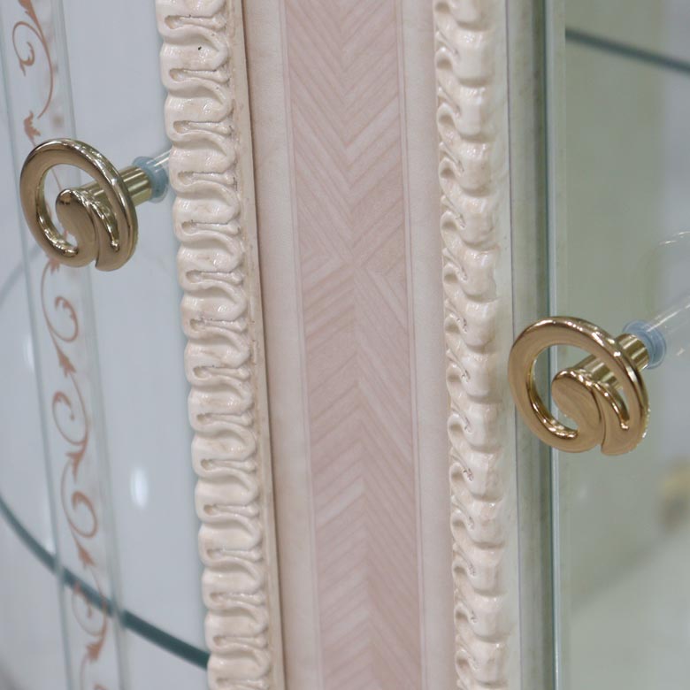 王冠のような天飾りと猫脚、ゴールドの装飾金具と アラベスク紋様のガラス扉、宮廷風のテイストがより ラグジュアリーな風格のヴェルサイユシリーズ。