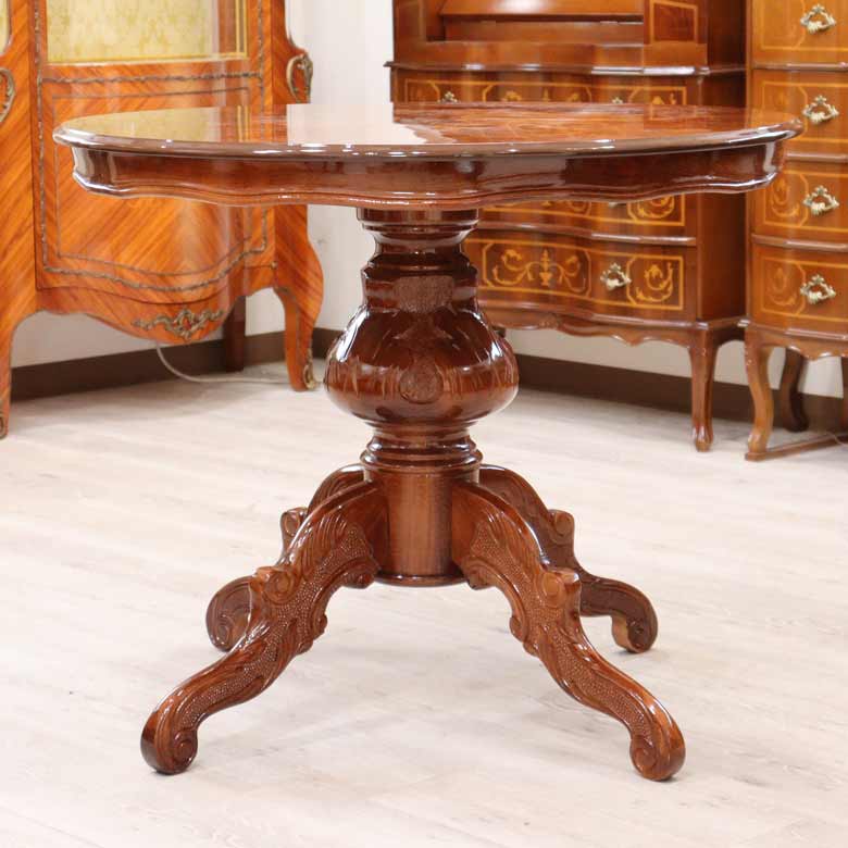 曲線の丸みのある天板にアンティークブラウンの艶のある光沢のある鏡面仕上げは高級感があります。