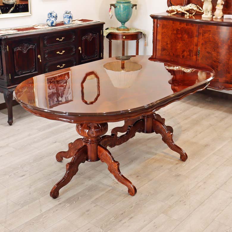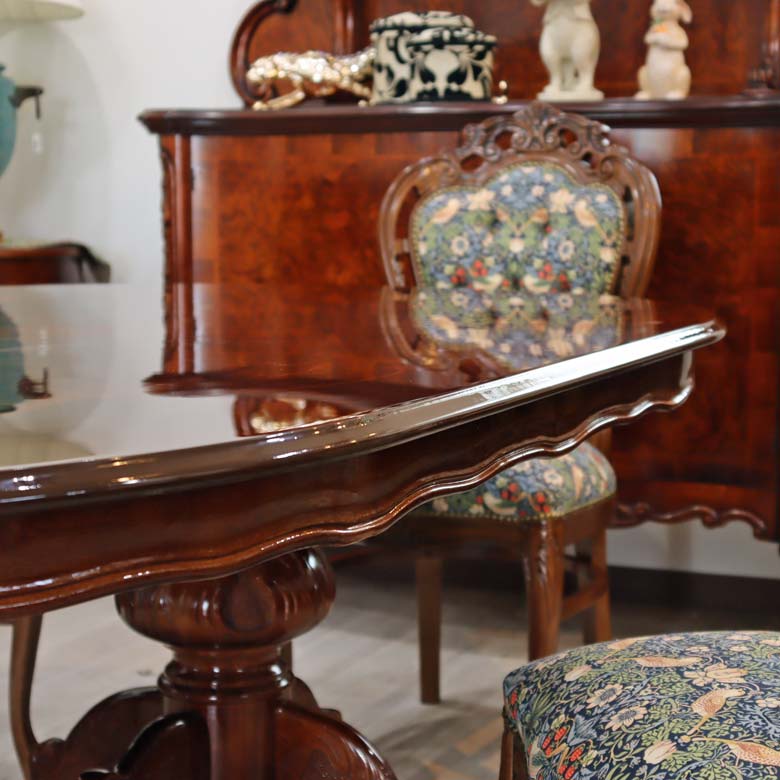 曲線の丸みのある天板にアンティークブラウンの艶のある光沢のある鏡面仕上げは高級感があります。