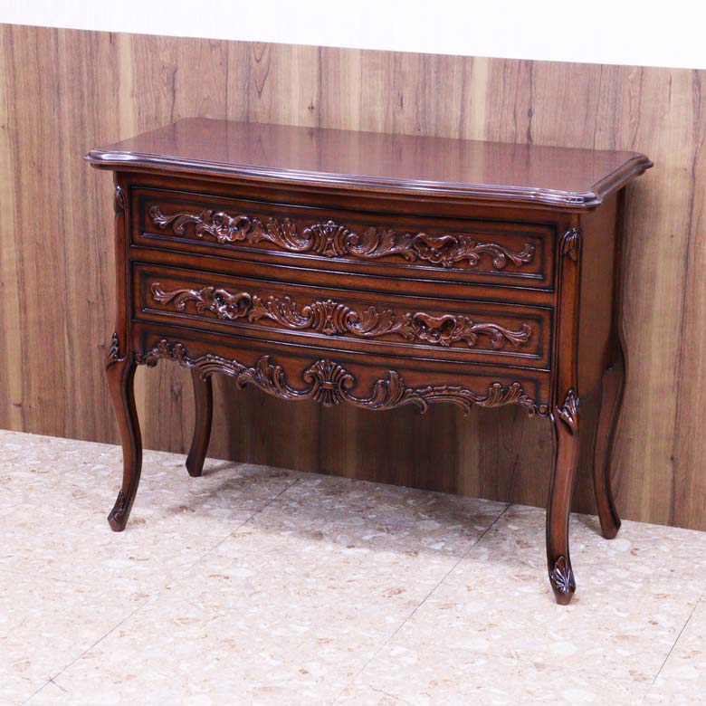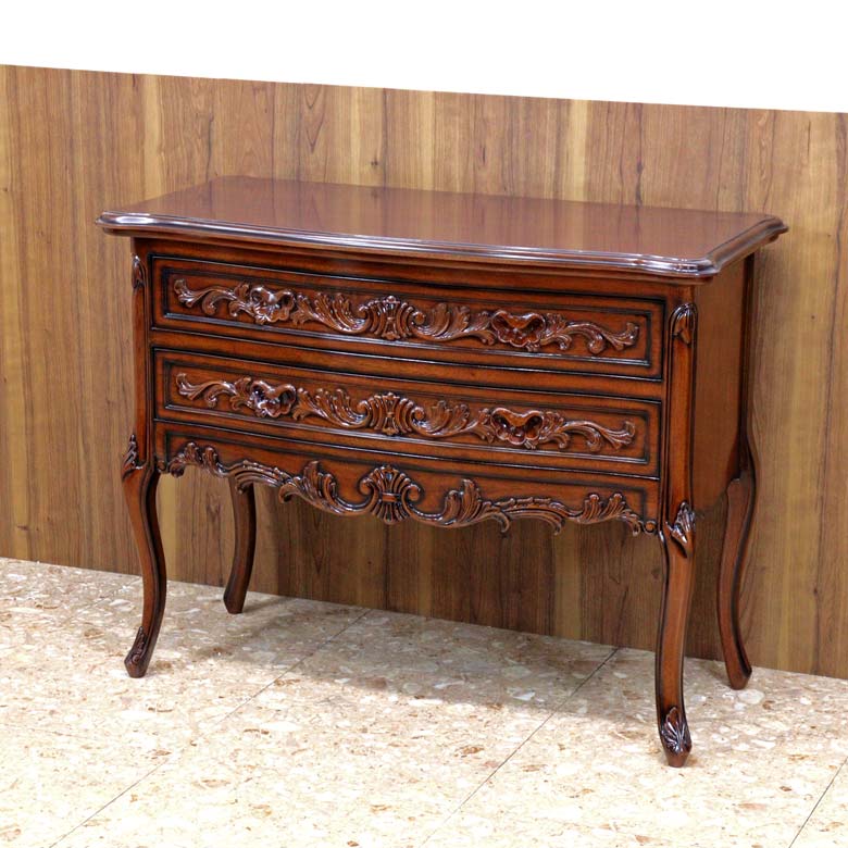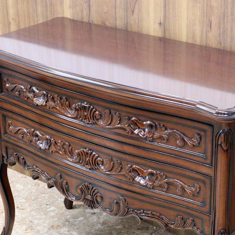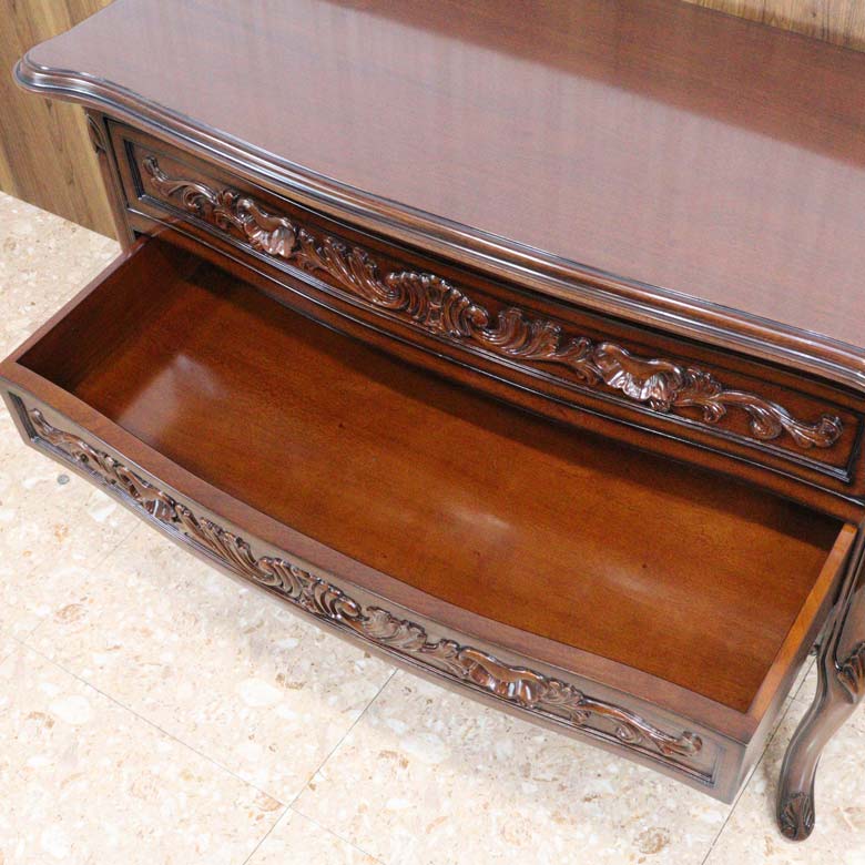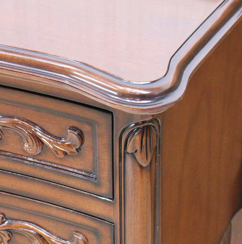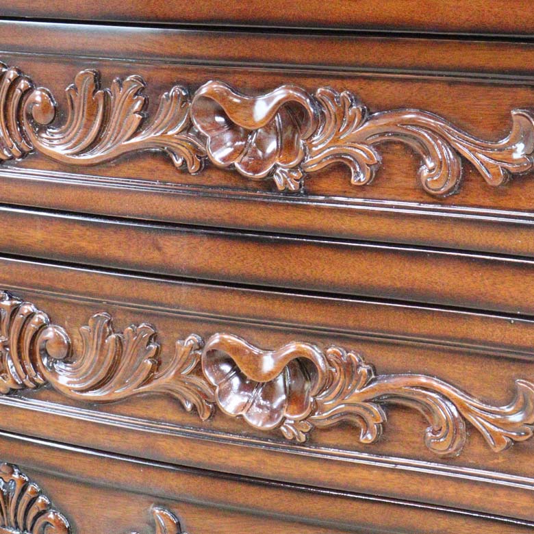高級家具などにつかわれるマホガニーを使用し、深みのある色合いと細部に施された彫刻(カービング)が優雅な雰囲気を演出します。