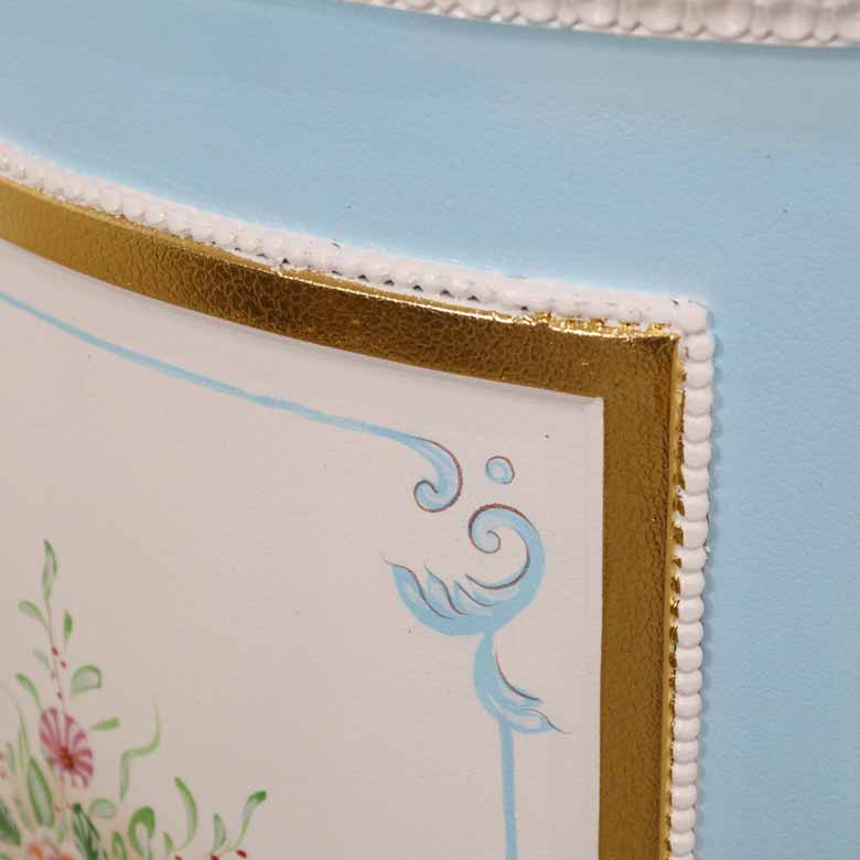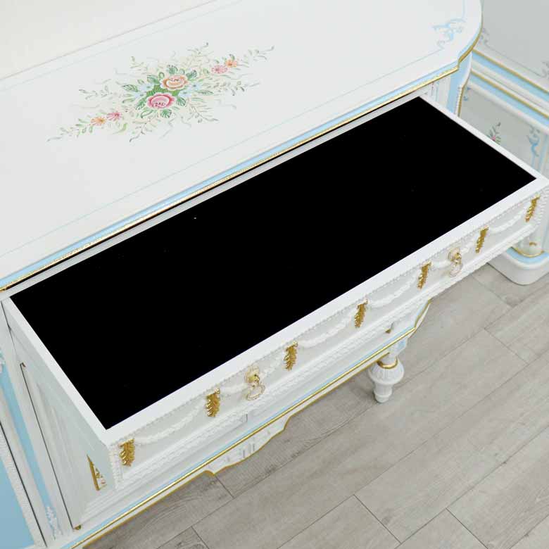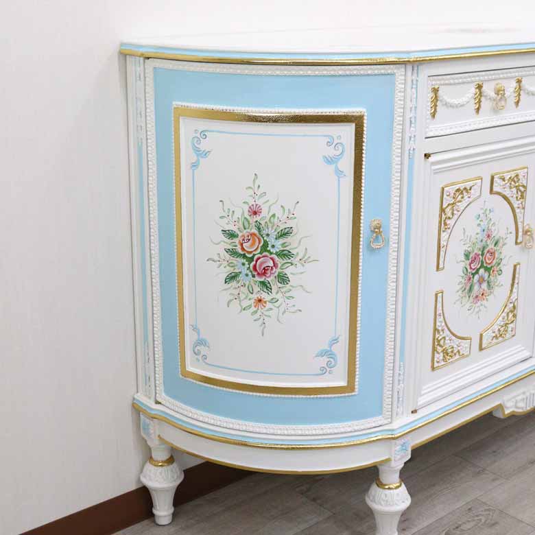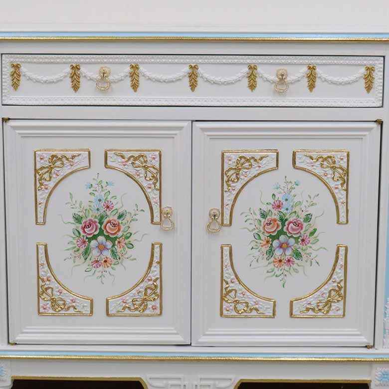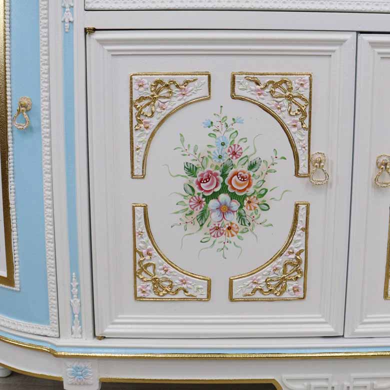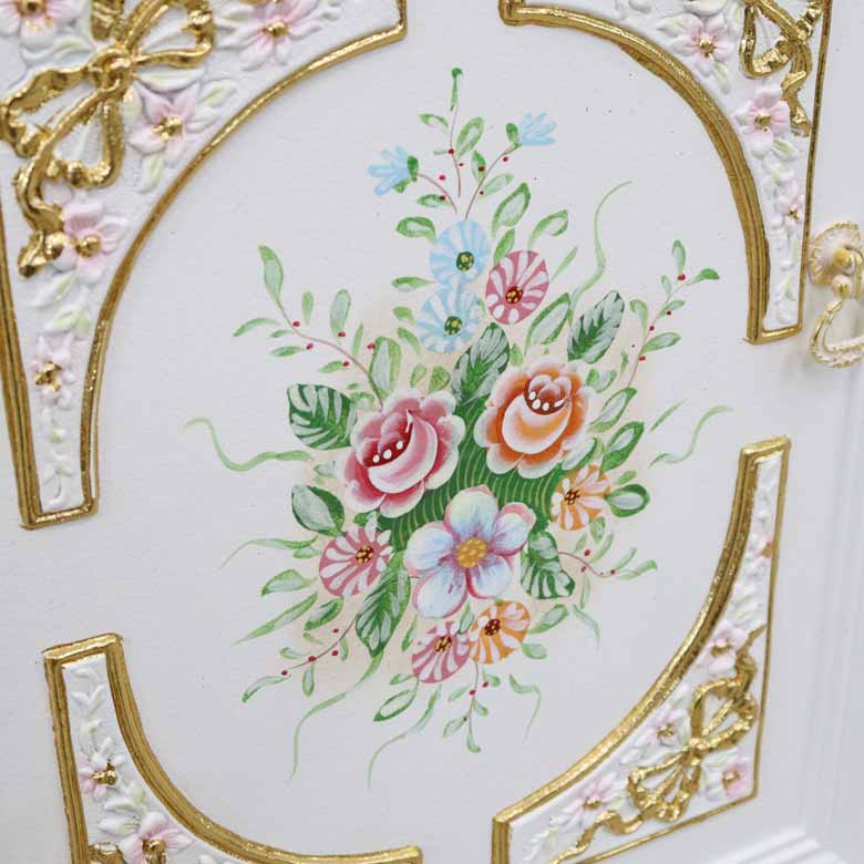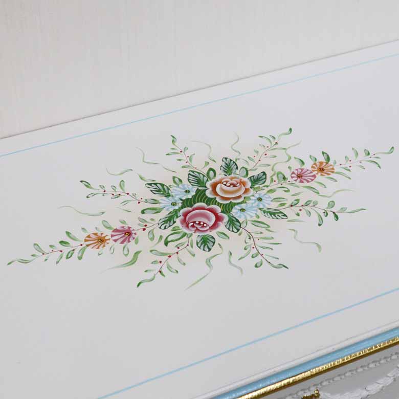 天板やドア部にはハンドペイントによって描かれたバラ(ローズ)デザインのモチーフをあしらい、