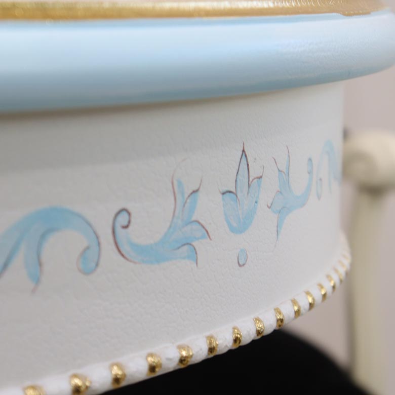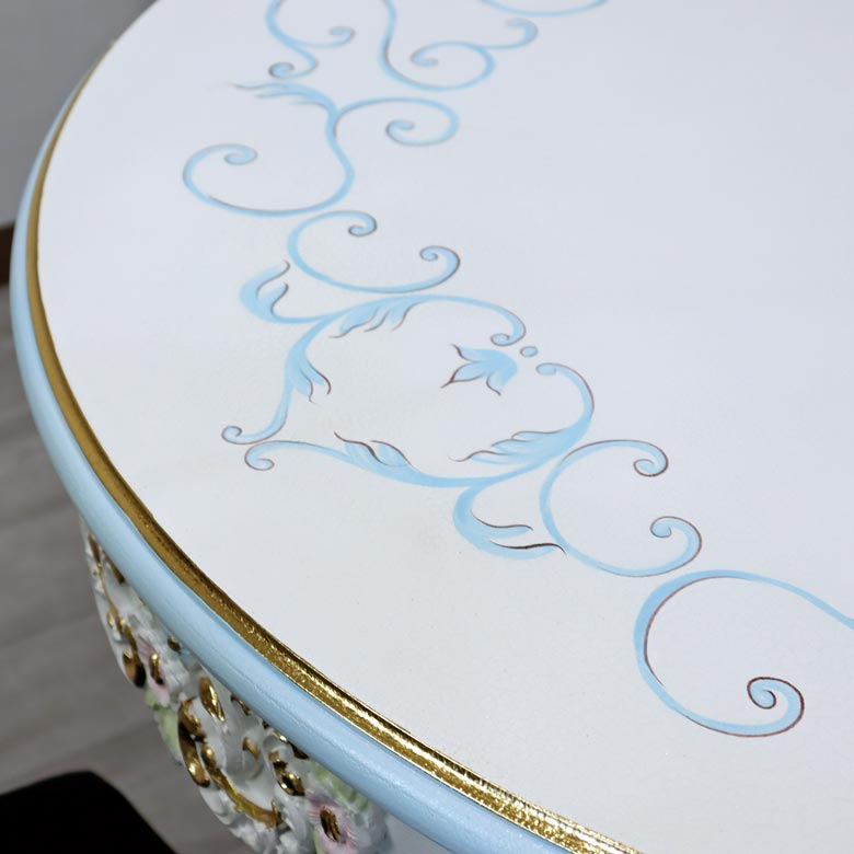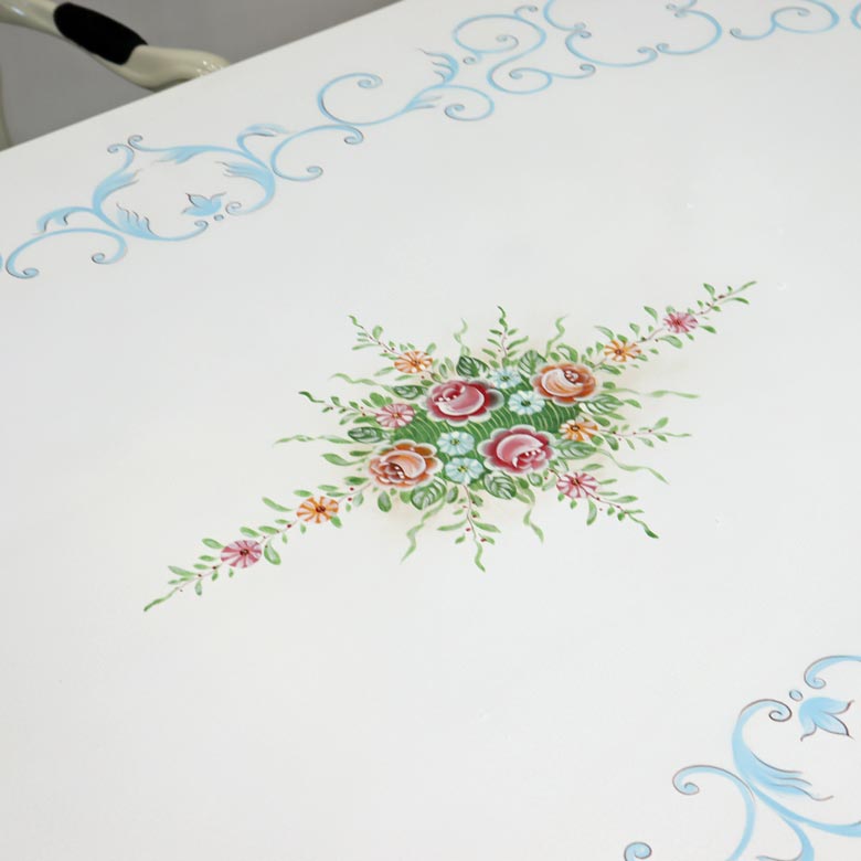 天板やドア部にはハンドペイントによって描かれたバラ(ローズ)デザインのモチーフをあしらい、