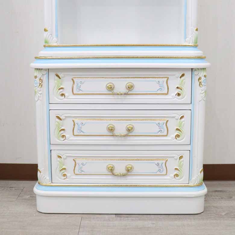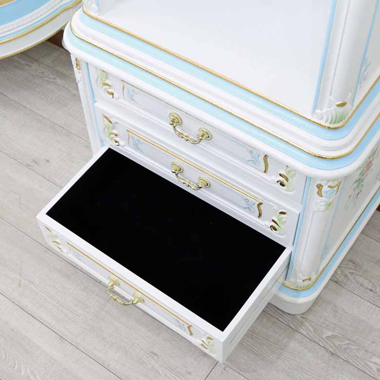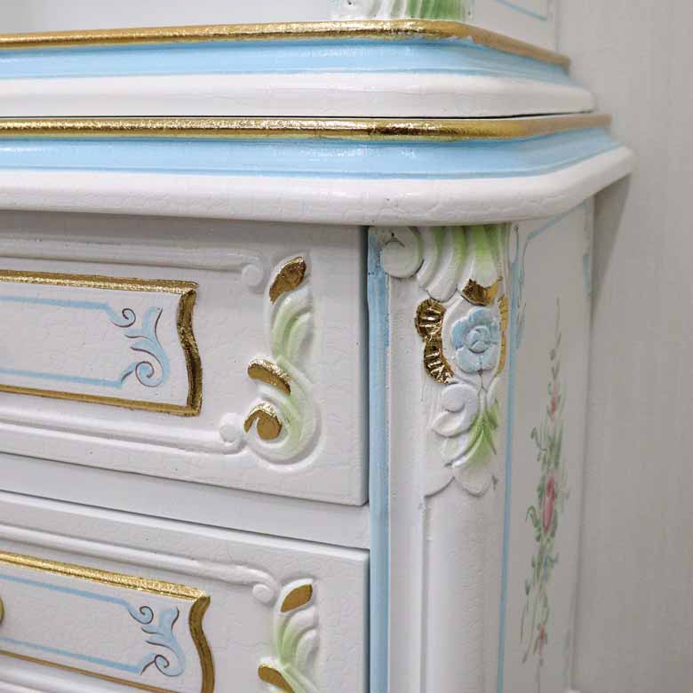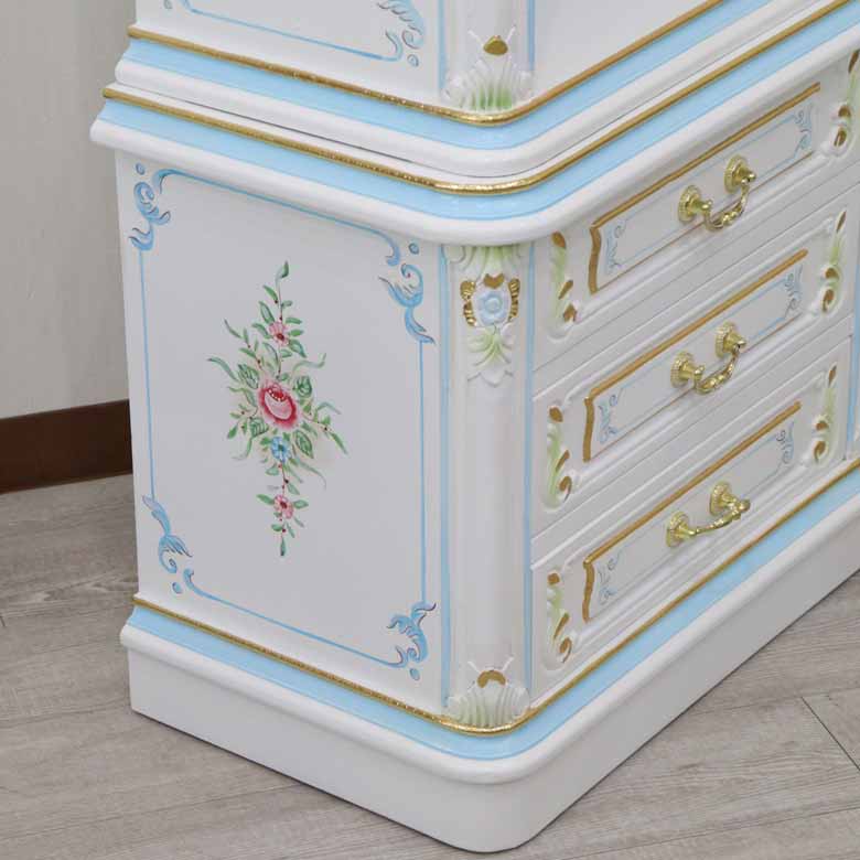 天板やドア部にはハンドペイントによって描かれたバラ(ローズ)デザインのモチーフをあしらい、
