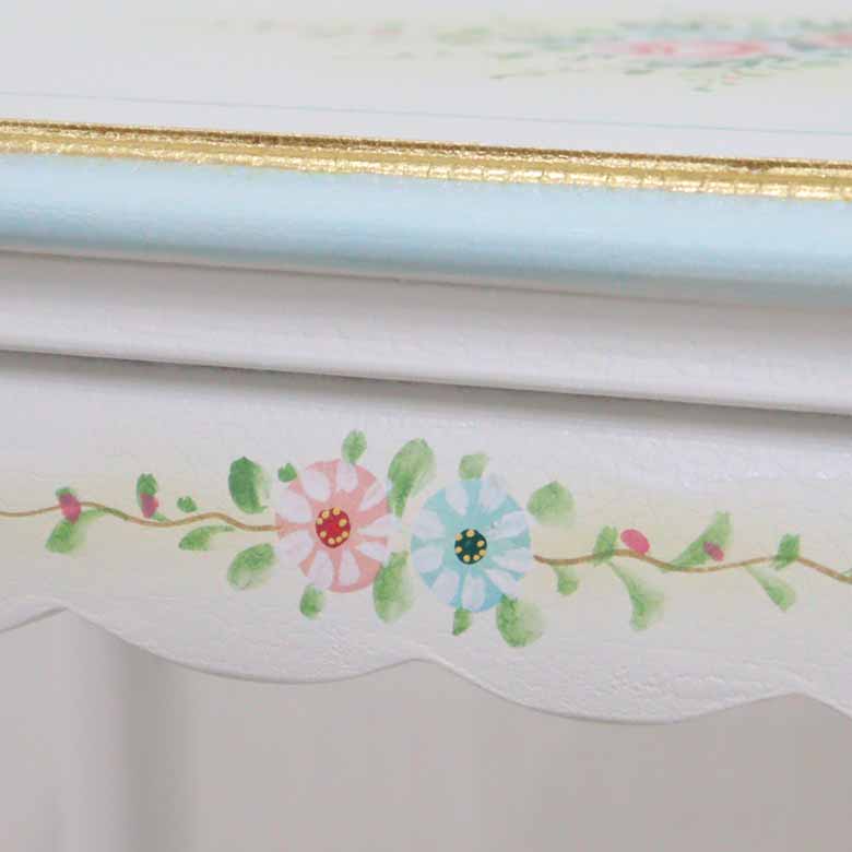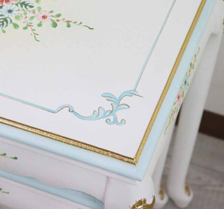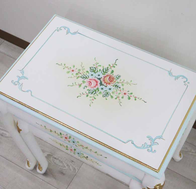 天板やドア部にはハンドペイントによって描かれたバラ(ローズ)デザインのモチーフをあしらい、