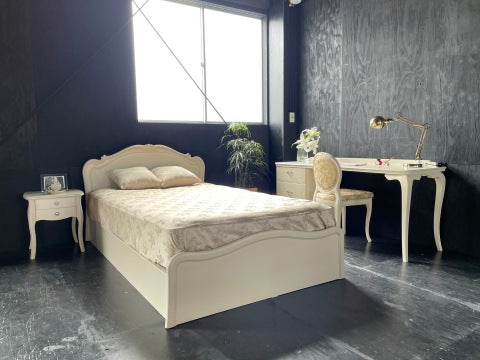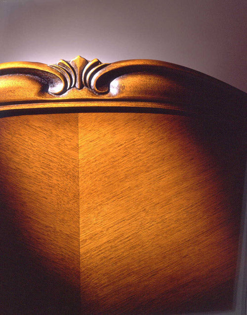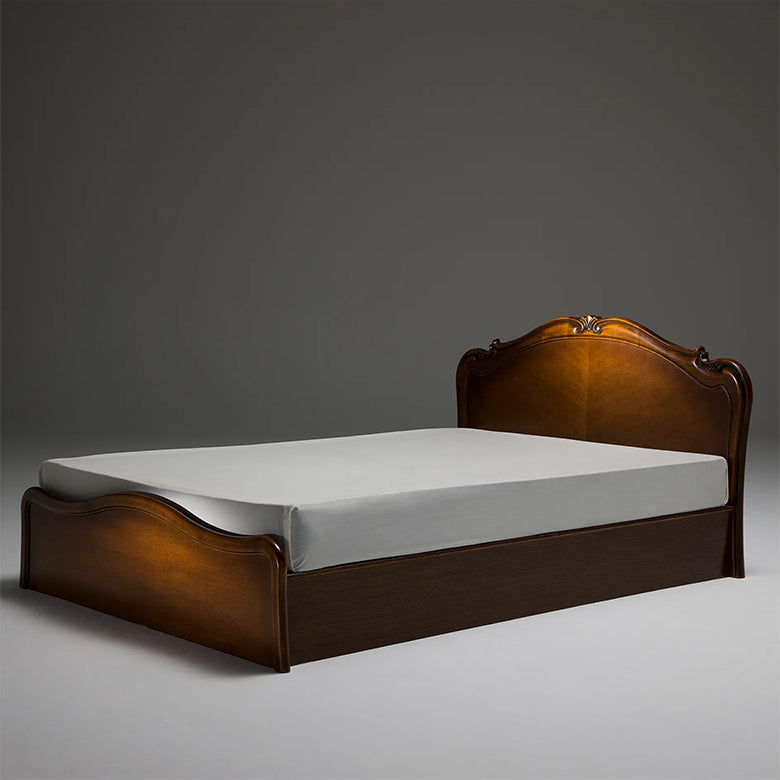 優雅なラインと大胆な彫刻が存在感を放ち、頼もしささえ感じる重厚感あるベッドフレーム。 職人が彫刻刀で一本ずつ丁寧に掘り込み、指先の感覚を頼りに研磨を繰り返して作り出した、繊細で華やかな美しい曲線美が特徴のフレームです。