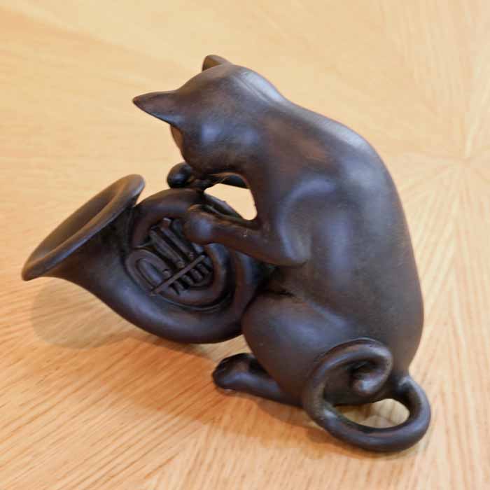 樹脂製 猫のオーケストラ ホルン アンティーク調 ブラック 猫雑貨