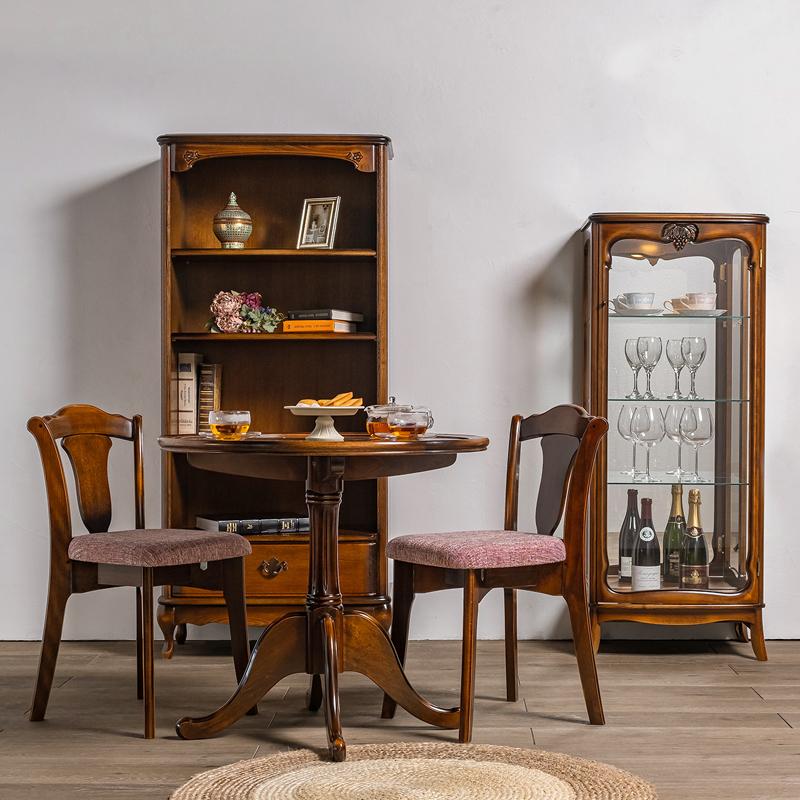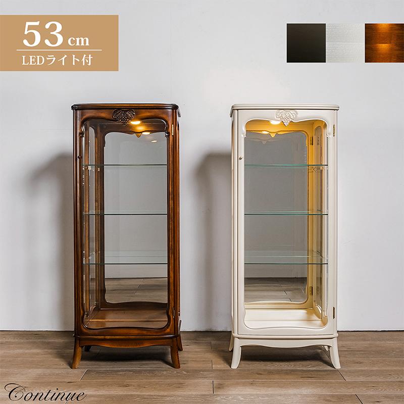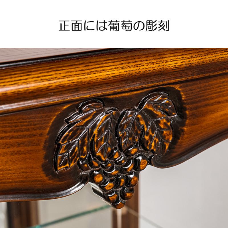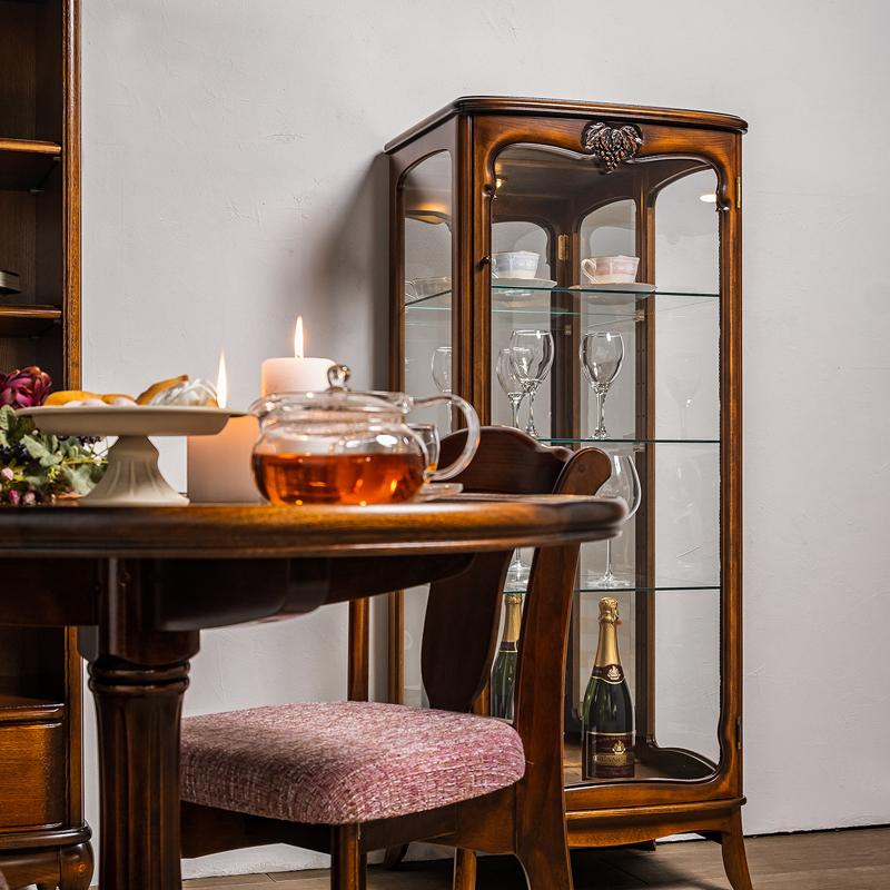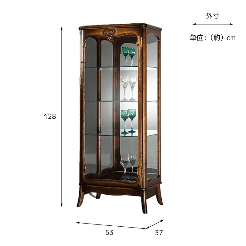 葡萄の彫刻がアクセントになった美しいフォルムのキュリオケース。幅は530㎝、高さ1280㎝と程よくコンパクトサイズでありながら、お気に入りのカップやグラス、飾り物などをしっかりと飾れる容量です。