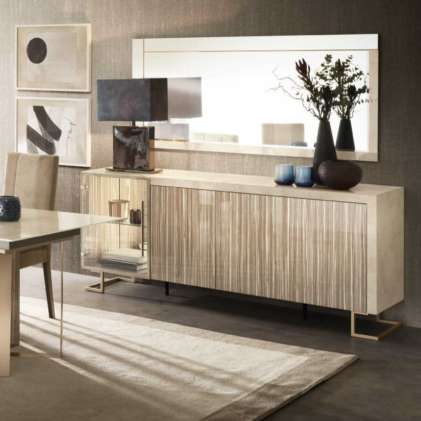 鏡面のアクセントと、ベージュを基調としたゼブラノ風の木目、そしてすっきりとしたエレガントなラインが、モダンで開放感のあるインテリアを演出します。